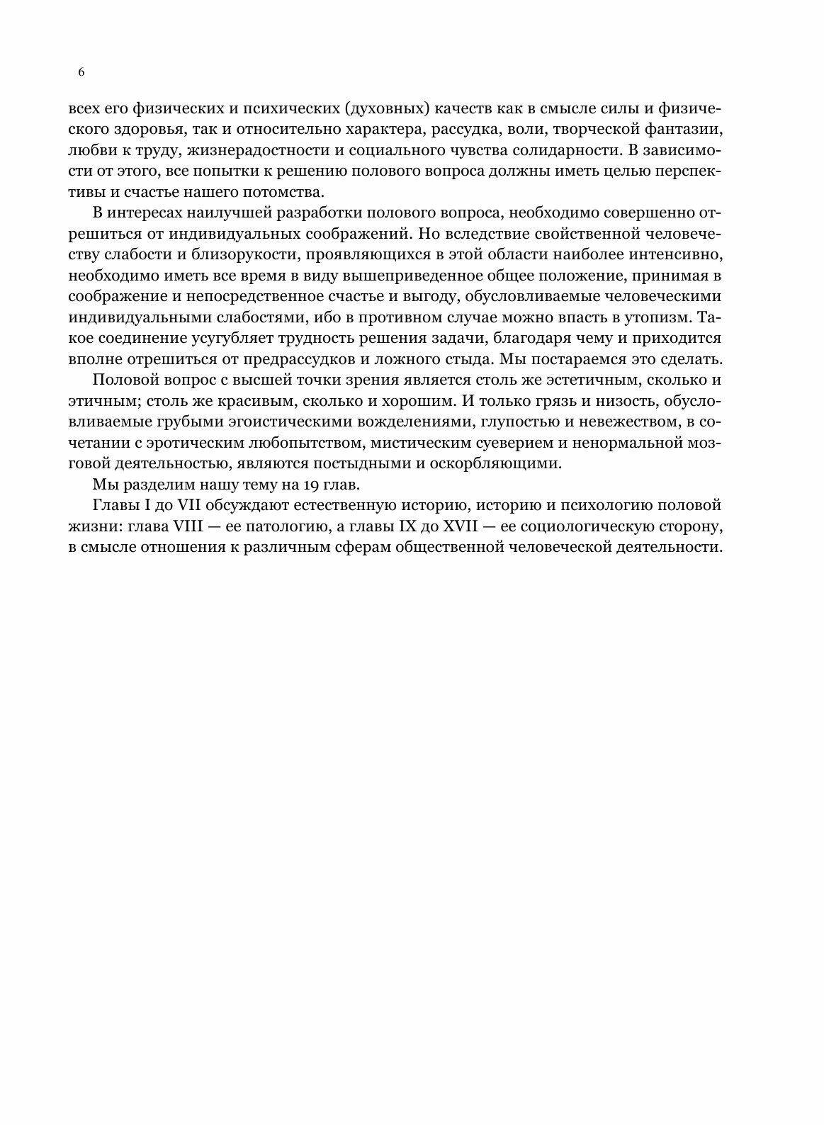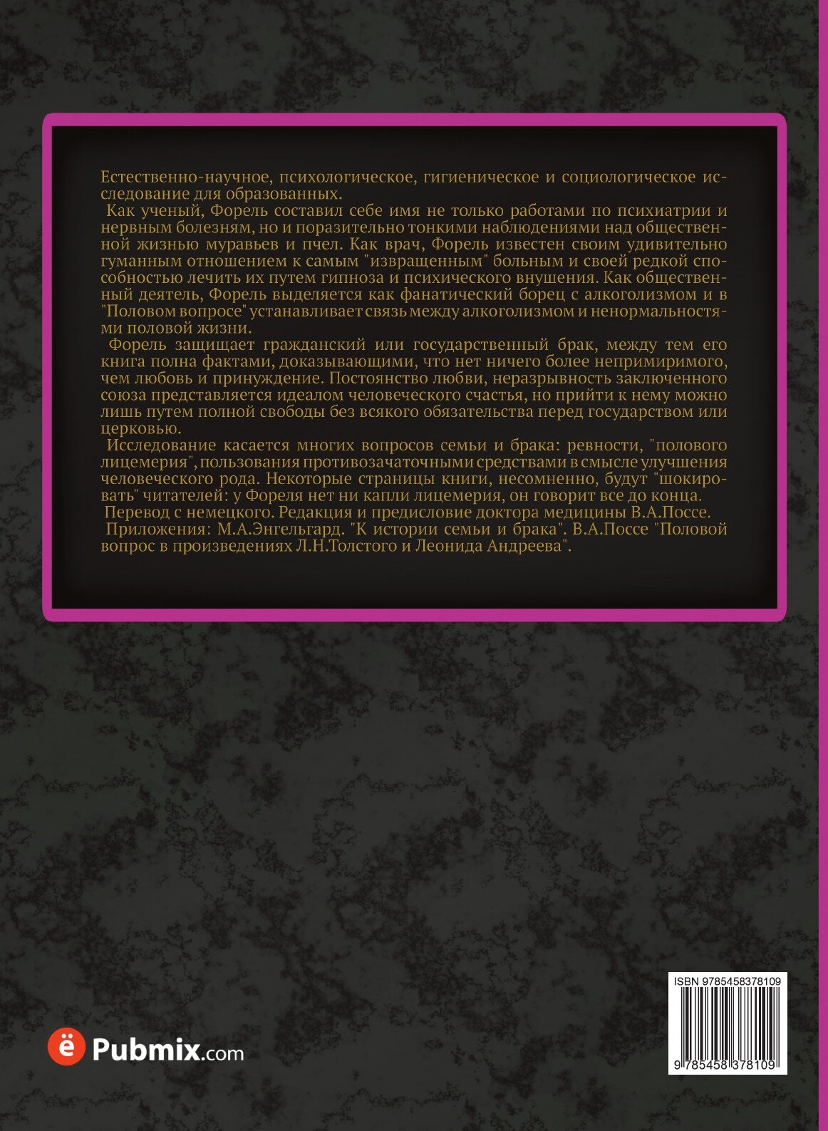 Естественно-научное, психологическое, гигиеническое и социологическое исследование для образованных. Как ученый, Форель составил себе имя не только работами по психиатрии и нервным болезням, но и поразительно тонкими наблюдениями над общественной жизнью муравьев и пчел. Как врач, Форель известен своим удивительно гуманным отношением к самым "извращенным" больным и своей редкой способностью лечить их путем гипноза и психического внушения. Как общественный деятель, Форель выделяется как фанатический борец с алкоголизмом и в "Половом вопросе" устанавливает связь между алкоголизмом и ненормальностями половой жизни. Форель защищает гражданский или государственный брак, между тем его книга полна фактами, доказывающими, что нет ничего более непримиримого, чем любовь и принуждение. Постоянство любви, неразрывность заключенного союза представляется идеалом человеческого счастья, но прийти к нему можно лишь путем полной свободы без всякого обязательства перед государством или церковью. Исследование касается многих вопросов семьи и брака: ревности, "полового лицемерия", пользования противозачаточными средствами в смысле улучшения человеческого рода. Некоторые страницы книги, несомненно, будут "шокировать" читателей: у Фореля нет ни капли лицемерия, он говорит все до конца. Перевод с немецкого. Редакция и предисловие доктора медицины В.А.Поссе. Приложения: М.А.Энгельгард. "К истории семьи и брака". В.А.Поссе "Половой вопрос в произведениях Л.Н.Толстого и Леонида Андреева".