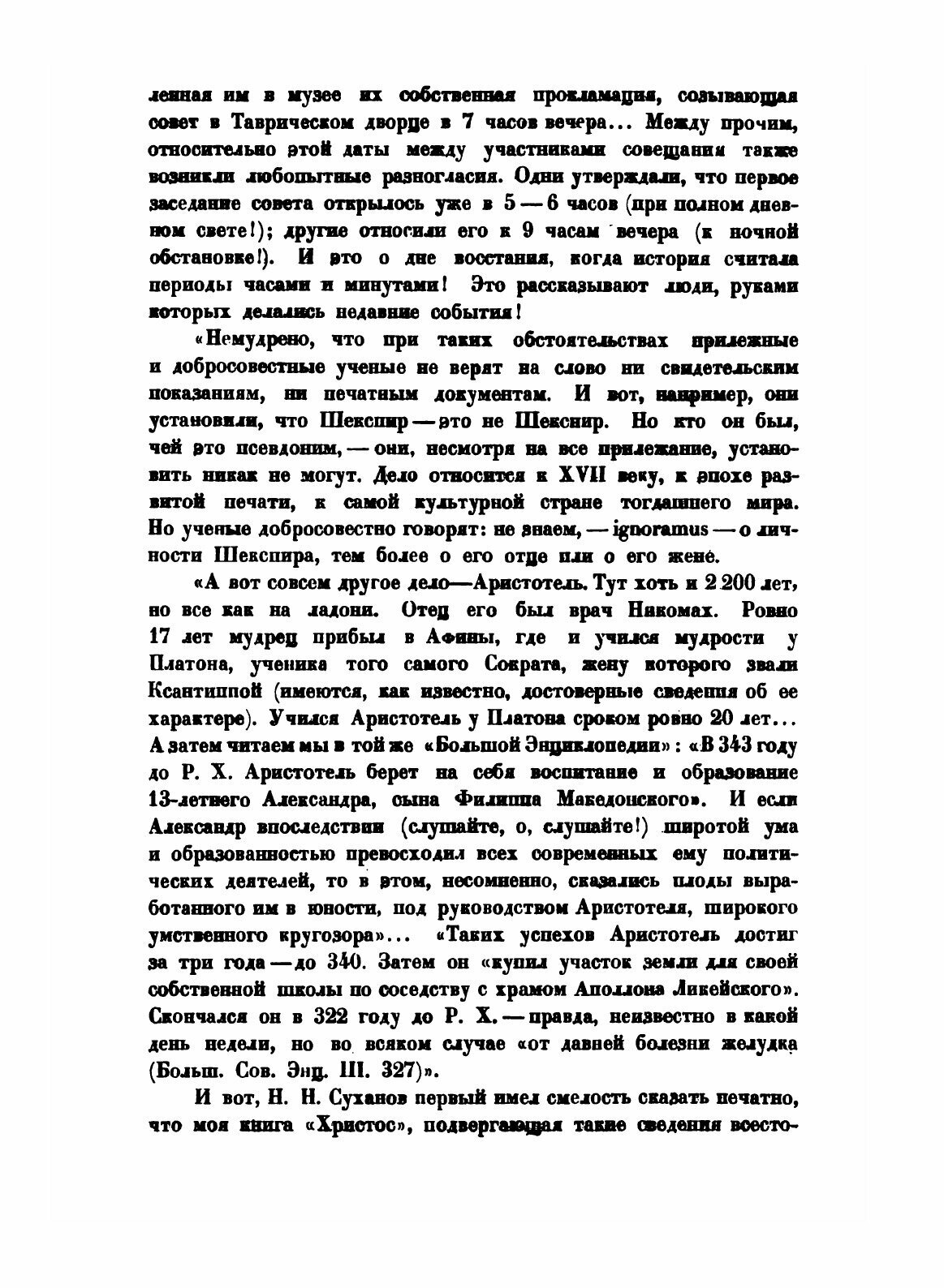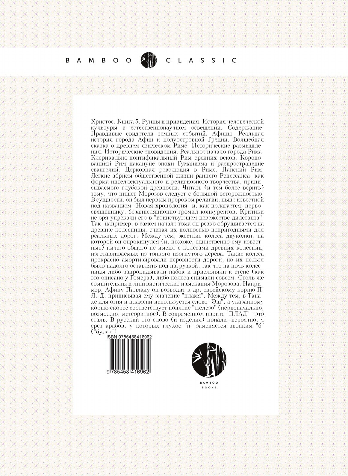 Христос. Книга 5. Руины и привидения. История человеческой культуры в естественнонаучном освещении. Содержание:Правдивые свидетели земных событий. Афины. Реальная история города Афин и полуостровной Греции. Волшебная сказка о древнем языческом Риме. Исторические размышления. Исторические сновидения. Реальное начало города Рима. Клерикально-понтификальный Рим средних веков. Коронованный Рим накануне эпохи Гуманизма и распространение евангелий. Церковная революция в Риме. Папский Рим. Легкие абрисы общественной жизни раннего Ренессанса, как форма интеллектуального и религиозного творчества, приписываемого глубокой древности. Читать (и тем более верить) тому, что пишет Морозов следует с большой осторожностью. В сущности, он был первым пророком религии, ныне известной под названием "Новая хронология" и, как полагается, первосвященнику, безаппеляционно громил конкурентов. Критики не зря упрекали его в "воинствующем невежестве дилетанта". Так, например, в самом начале тома он резко обрушивается на древние колесницы, считая их полностью непригодными для реальных дорог. Между тем, жесткие колеса двуколки, на которой он опрокинулся (и, похоже, единственно ему известные) ничего общего не имеют с колесами древних колесниц, изготавливаемых из тонкого изогнутого дерева. Такие колеса прекрасно амортизировали неровности дороги, но их нельзя было надолго оставлять под нагрузкой, так что на ночь колесницы либо запрокидывали набок и прислоняли к стене (как это описано у Гомера), либо колеса снимали совсем. Столь же сомнительны и лингвистические изыскания Морозова. Например, Афину Палладу он возводит к др. еврейскому корню П. Л. Д, приписывая ему значение "пламя". Между тем, в Танахе для огня и пламени используется слово "Эш", а указанному корню скорее соответствует понятие "железо" (первоначально, возможно, метеоритное). В современном иврите "ПЛАД" - это сталь. В русский это слово (и изделия) попали, вероятно, через арабов, у которых глухое "п" заменяется звонким "б" ("булат").