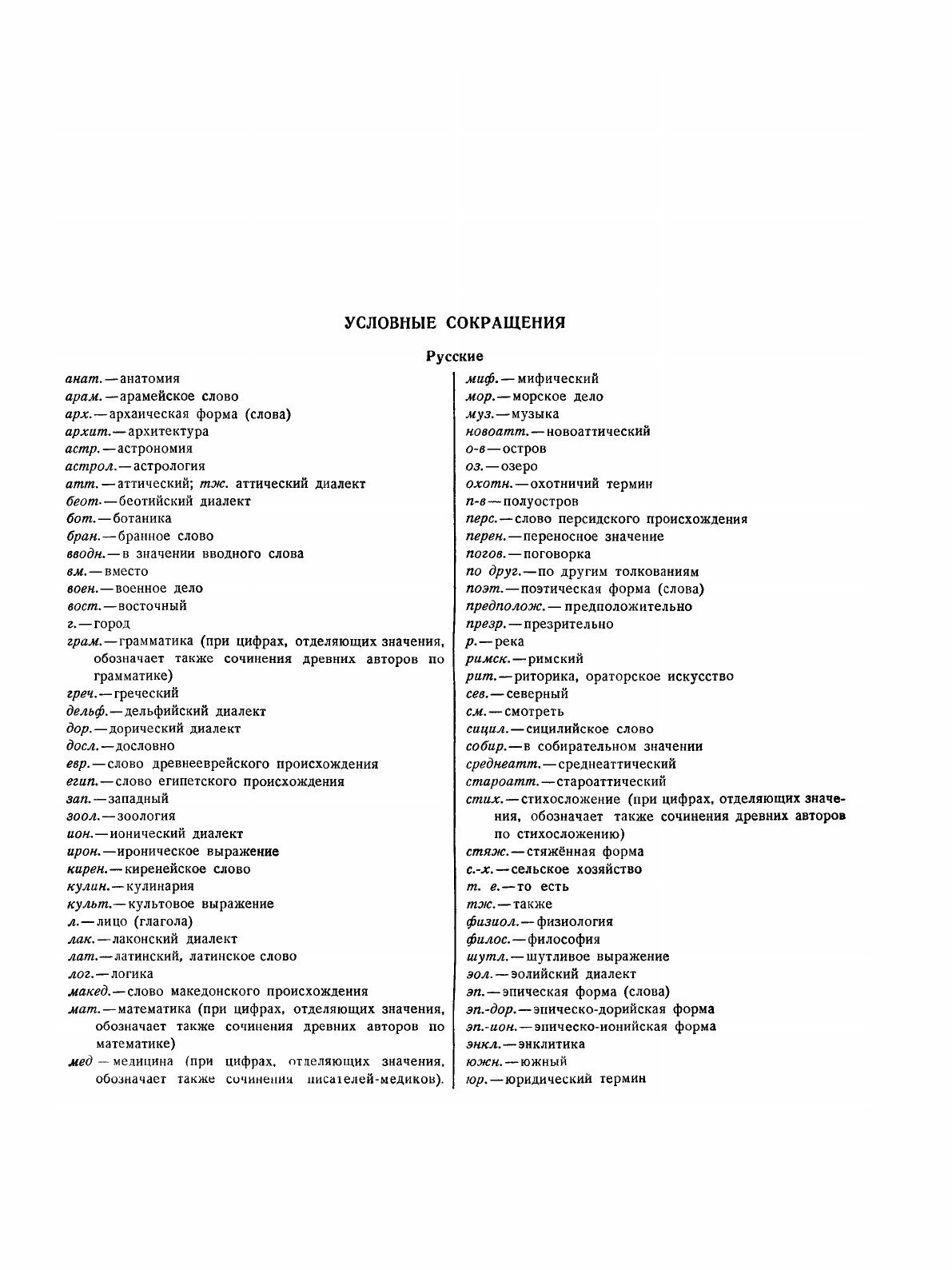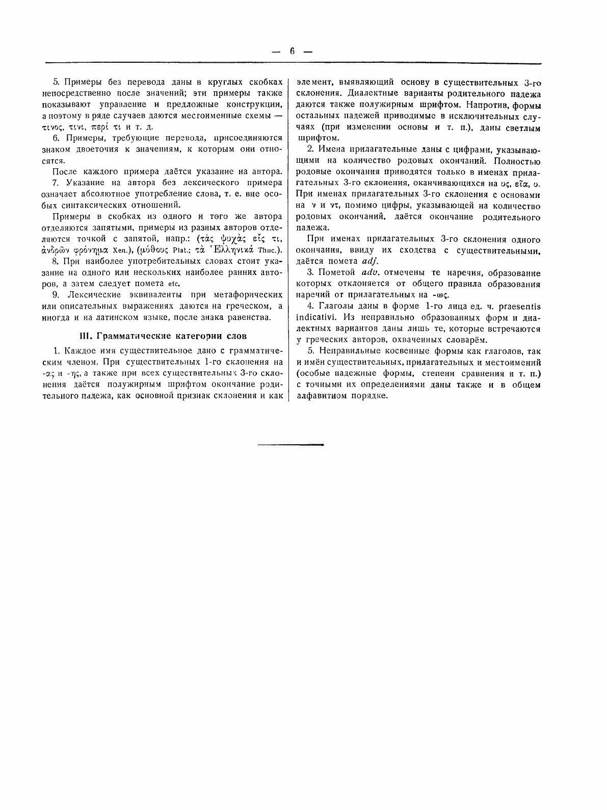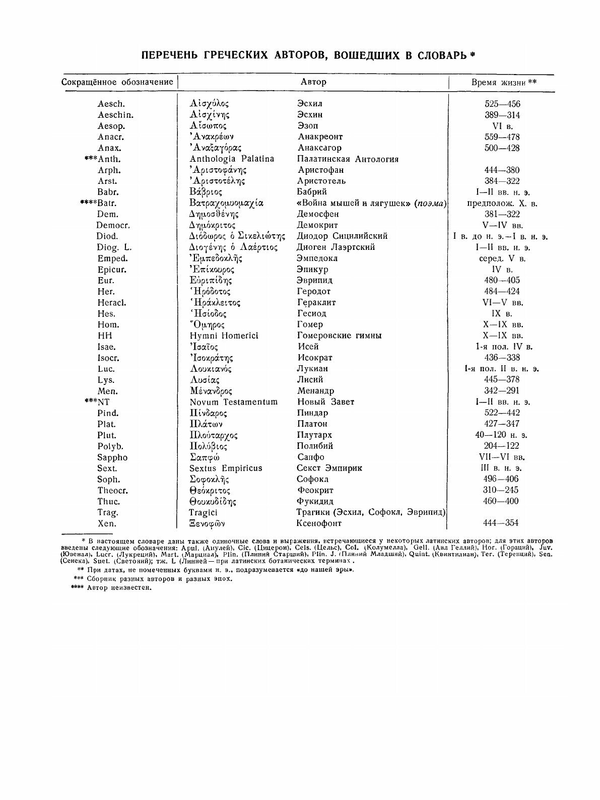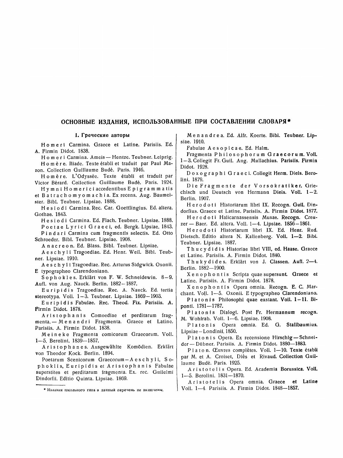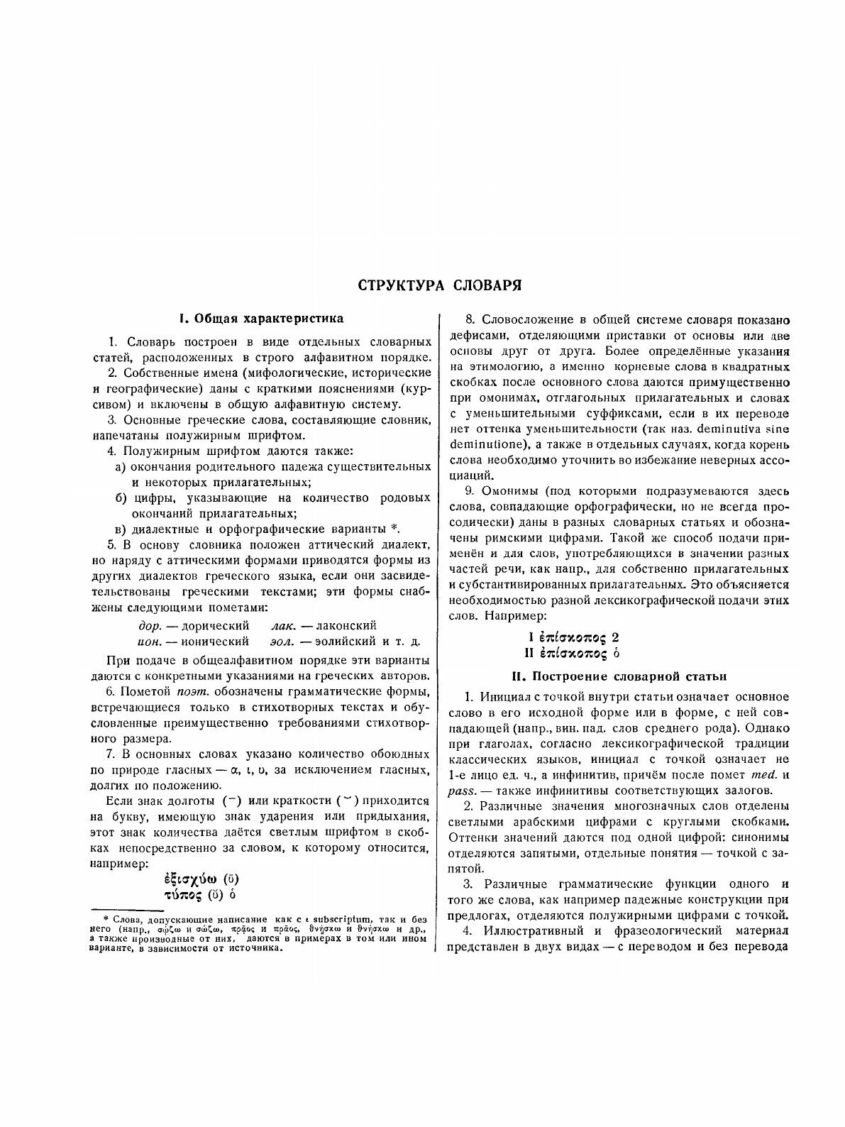 Книга была выпущена государственным издательством иностранных и национальных словарей в 1958 г. и больше не переиздавалась.Это самый полный древнегреческо-русский словарь, он содержит 70 тысяч статей со множеством цитат из древних авторов. до н.э. по II в. н.э.В словарь вошли греческие слова и выражения, встречающиеся в сочинениях римских писателей.Имена собственные (ономастика и топонимика) даны с краткими пояснениями и включены в общую алфавитную систему. Географические названия даны с наибольшей полнотой; из имен исторических и мифологических исключены лишь второстепенные.Почти все значения слов иллюстрированы лексическими и фразеологическими примерами.