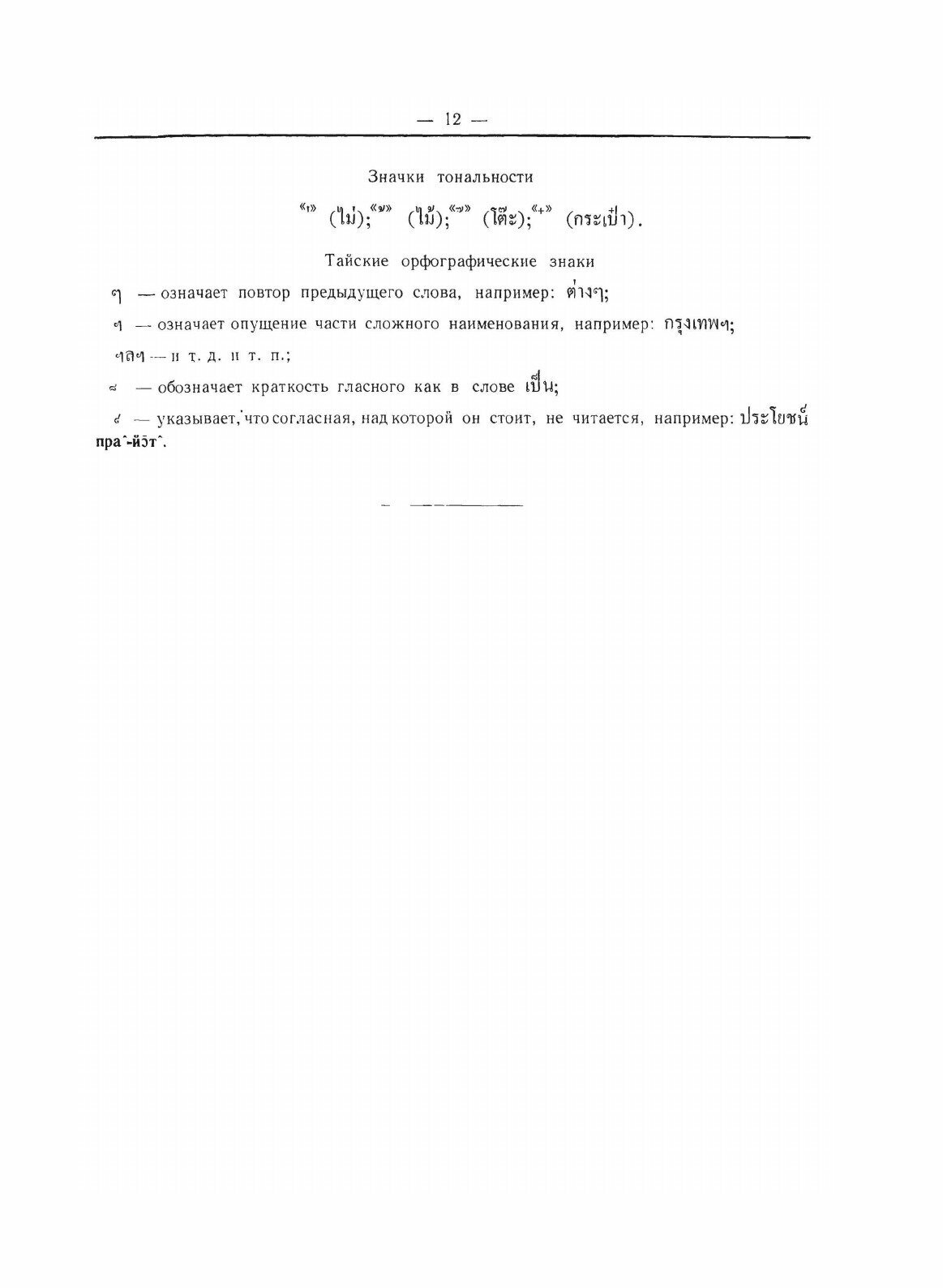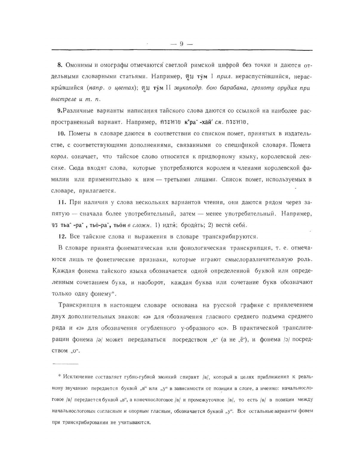 Тайско-русский словарь включает около 26000 слов. В словаре представлена преимущественно современная лексика, главным образом общественно-политического характера.В виде специального приложения к словарю дается список географических названий.Следует иметь в виду, что в таиландской литературе, особенно в периодической печати, нет единообразия в написании многих иностранных географических названий, которое обычно основывается на соответствующем английском названии. Для словаря географические названия взяты из картографических пособий, изданных в Таиланде.В качестве приложения к словарю также даются; список таиландских мер и весов и их метрических эквивалентов, список таиландских денежных единиц и список условных сокращений, наиболее часто встречающихся в таиландской печати.Словарь сопровождается кратким грамматическим очерком тайского языка.