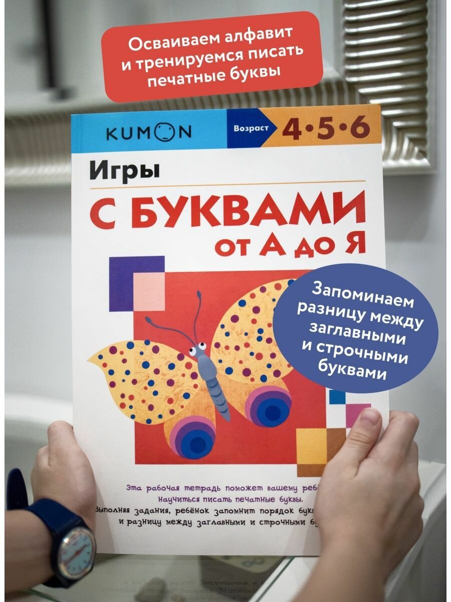 С помощью новой тетради "Kumon. Игры с буквами от А до Я" ребенок выучит алфавитный порядок букв, потренируется писать печатные буквы и запомнит разницу между заглавными и строчными буквами. А еще закрепит навык работы с карандашом и потренирует мелкую моторику.