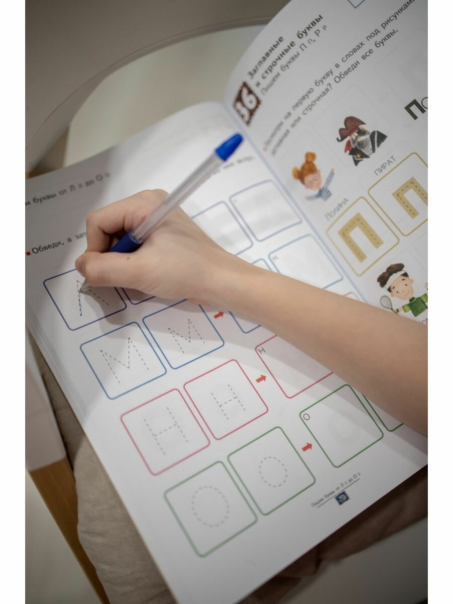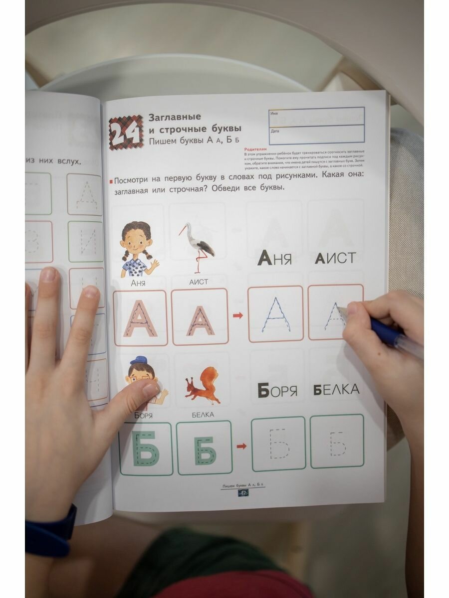 Заглавные и строчные буквы (№ 24-50): в этом разделе ребенок будет одновременно обводить и заглавные, и строчные буквы. Кроме того, на одной странице он увидит слова, которые начинаются с заглавной и со строчной буквы. Малышу предлагается придумать простое предложение из этих слов.