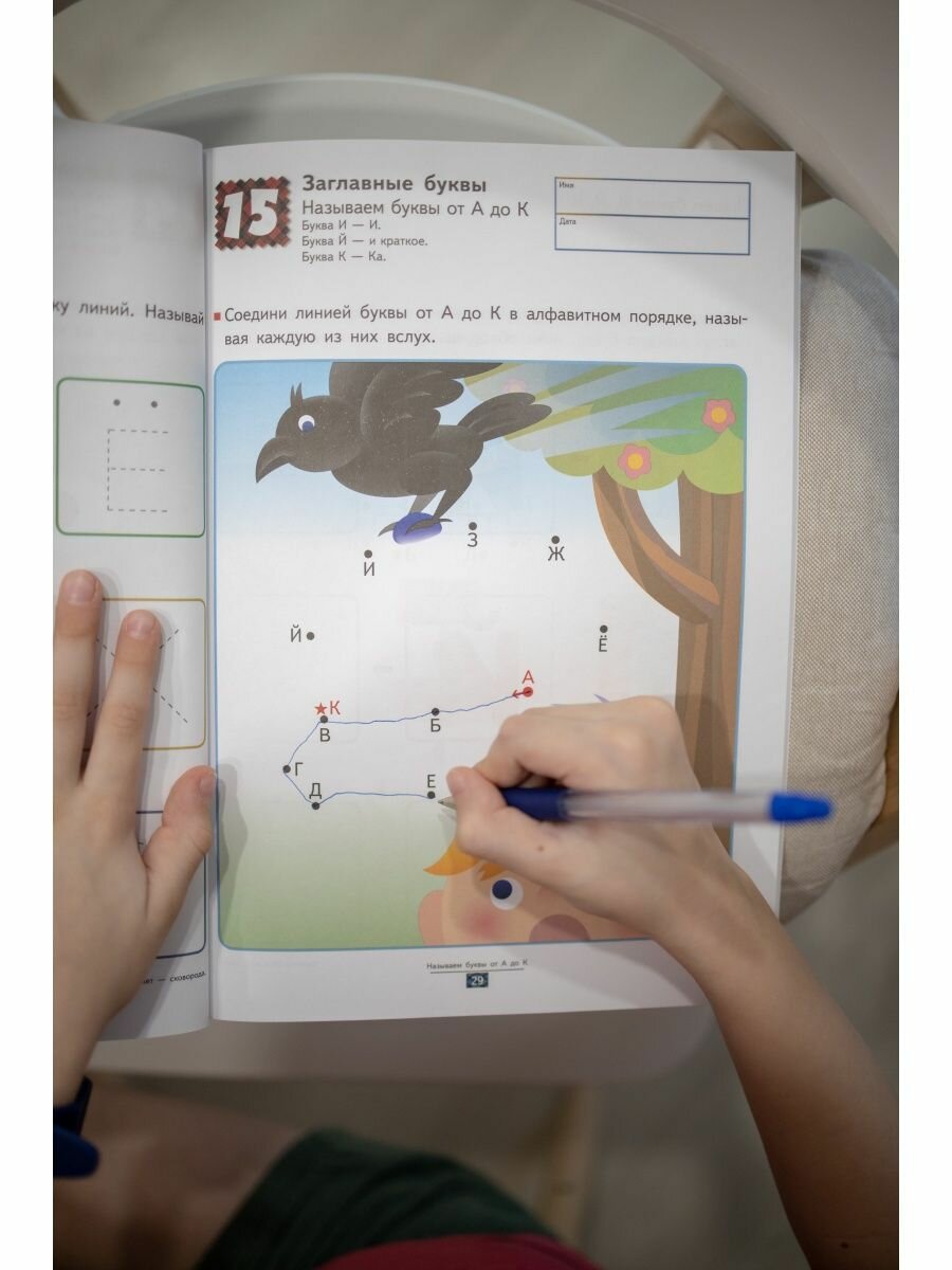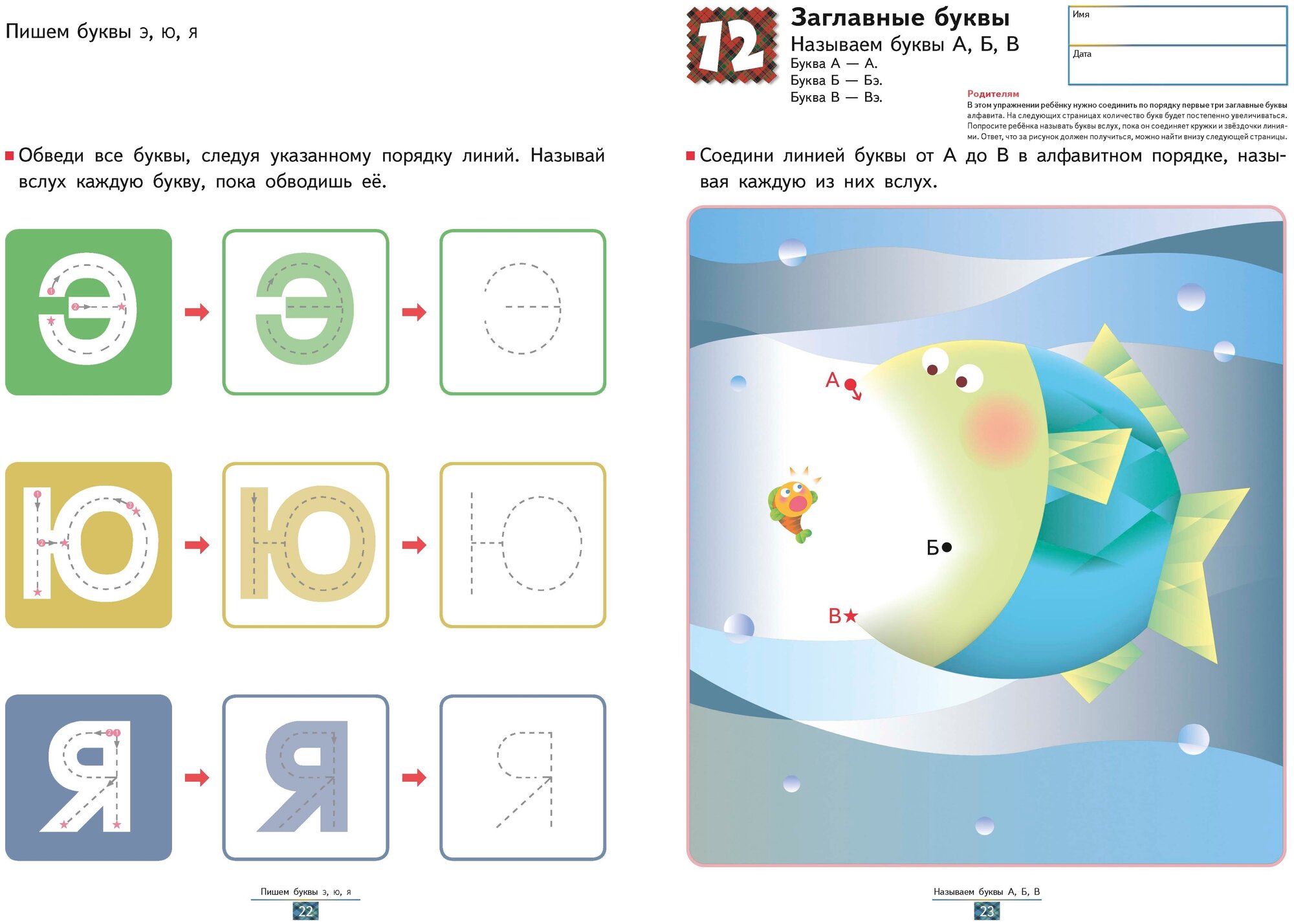 Заглавные буквы (№ 13-23): в упражнениях этого раздела ребенок проводит линии, соединяя между собой заглавные буквы в алфавитном порядке. Когда задание будет выполнено, малыш получит забавную картинку. Во второй части заданий ребенок также обводит буквы, называя их вслух.