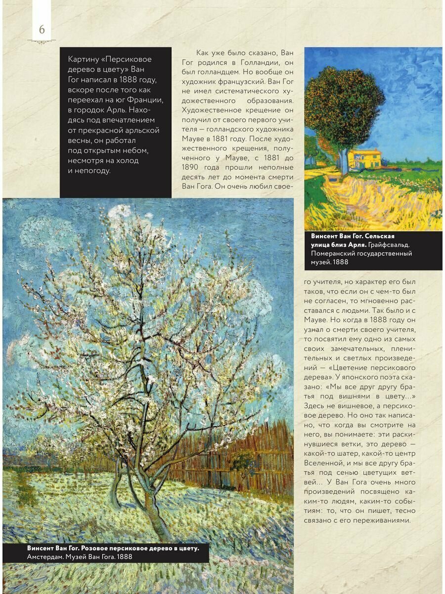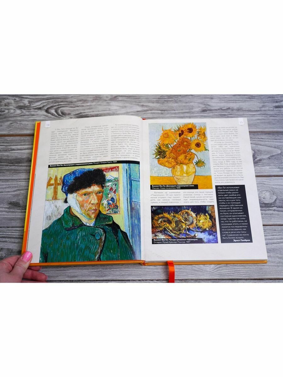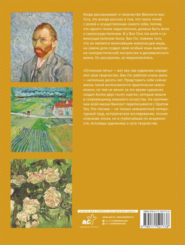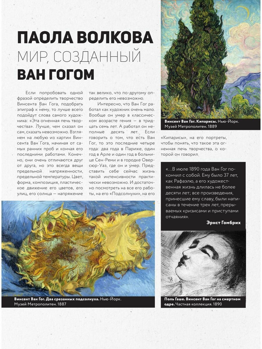 Книга для подарка, внешне впечатляет, оформлена красиво. Однако когда открываешь ее есть несколько моментов, которые смущают. Один из них это то, что многие картины пропечатаны в очень маленьком формате, хотя живопись Ван Гога, как я считаю, просто необходимо смотреть в его мазках, которых с таких крошечных картинках просто не разглядеть. Из плюсов книги это ее информативность, достаточно информации и соблюдена хронология событий и написания картин. Впечатление от книги очень неоднозначное, с одной стороны это красивый и добротный подарок,с другой стороны маленькие картинки очень портят ве впечатление.