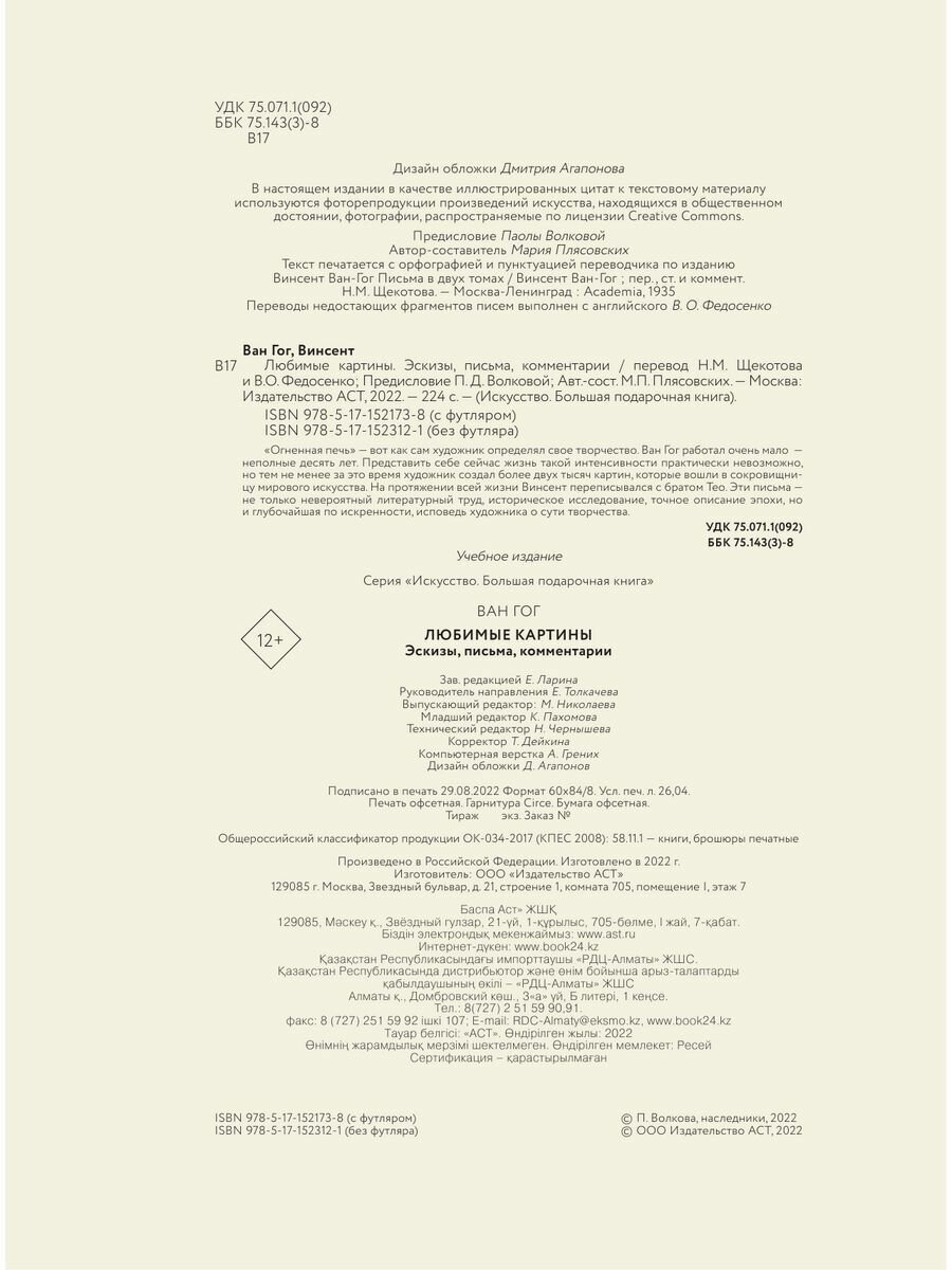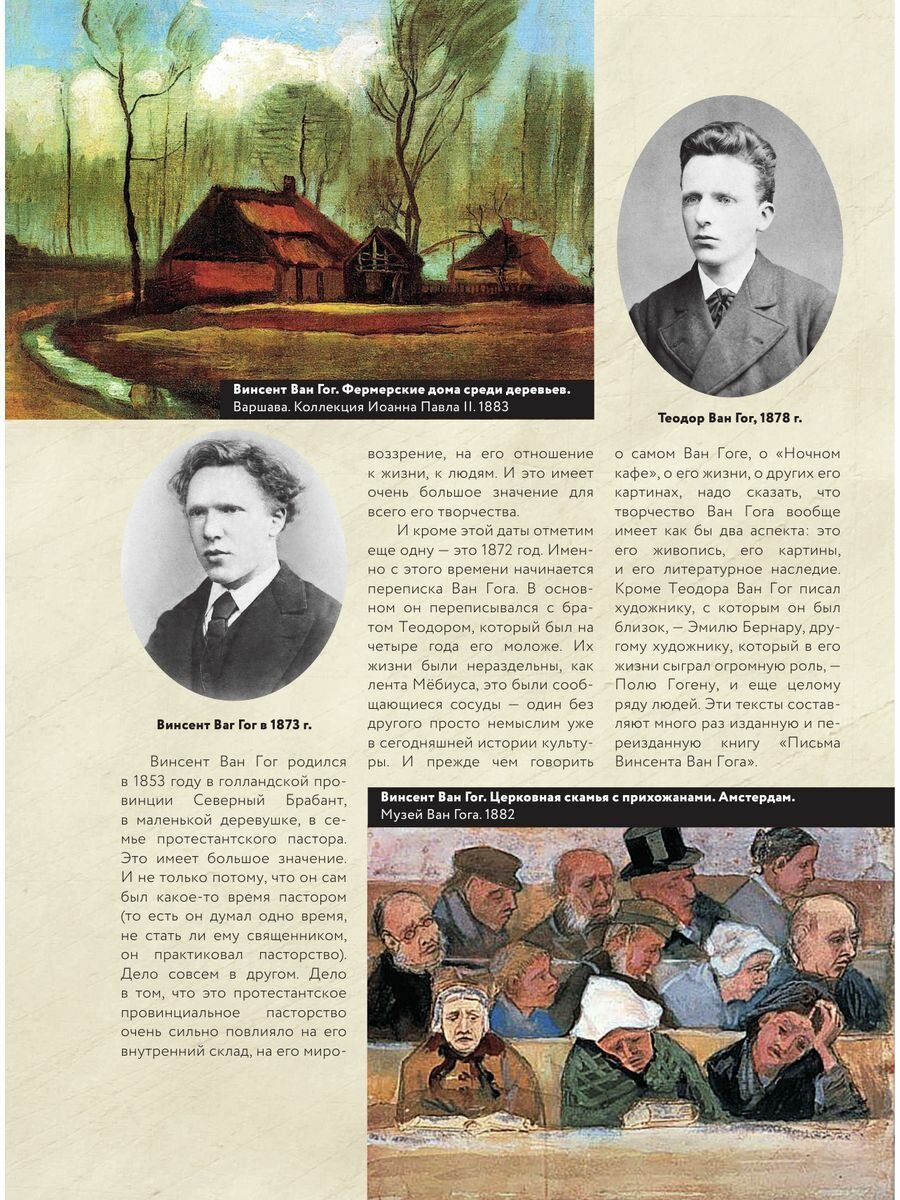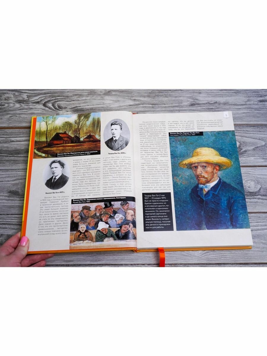 Книга для подарка, внешне впечатляет, оформлена красиво. Однако когда открываешь ее есть несколько моментов, которые смущают. Один из них это то, что многие картины пропечатаны в очень маленьком формате, хотя живопись Ван Гога, как я считаю, просто необходимо смотреть в его мазках, которых с таких крошечных картинках просто не разглядеть. Из плюсов книги это ее информативность, достаточно информации и соблюдена хронология событий и написания картин. Впечатление от книги очень неоднозначное, с одной стороны это красивый и добротный подарок,с другой стороны маленькие картинки очень портят ве впечатление.