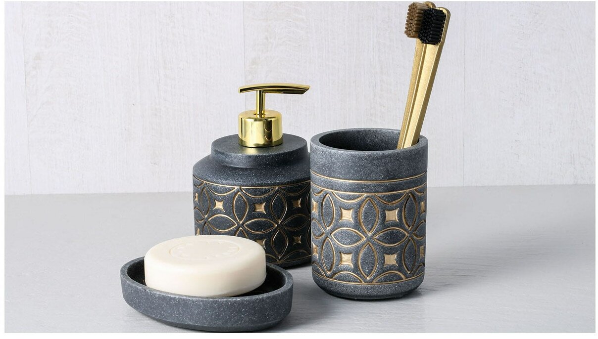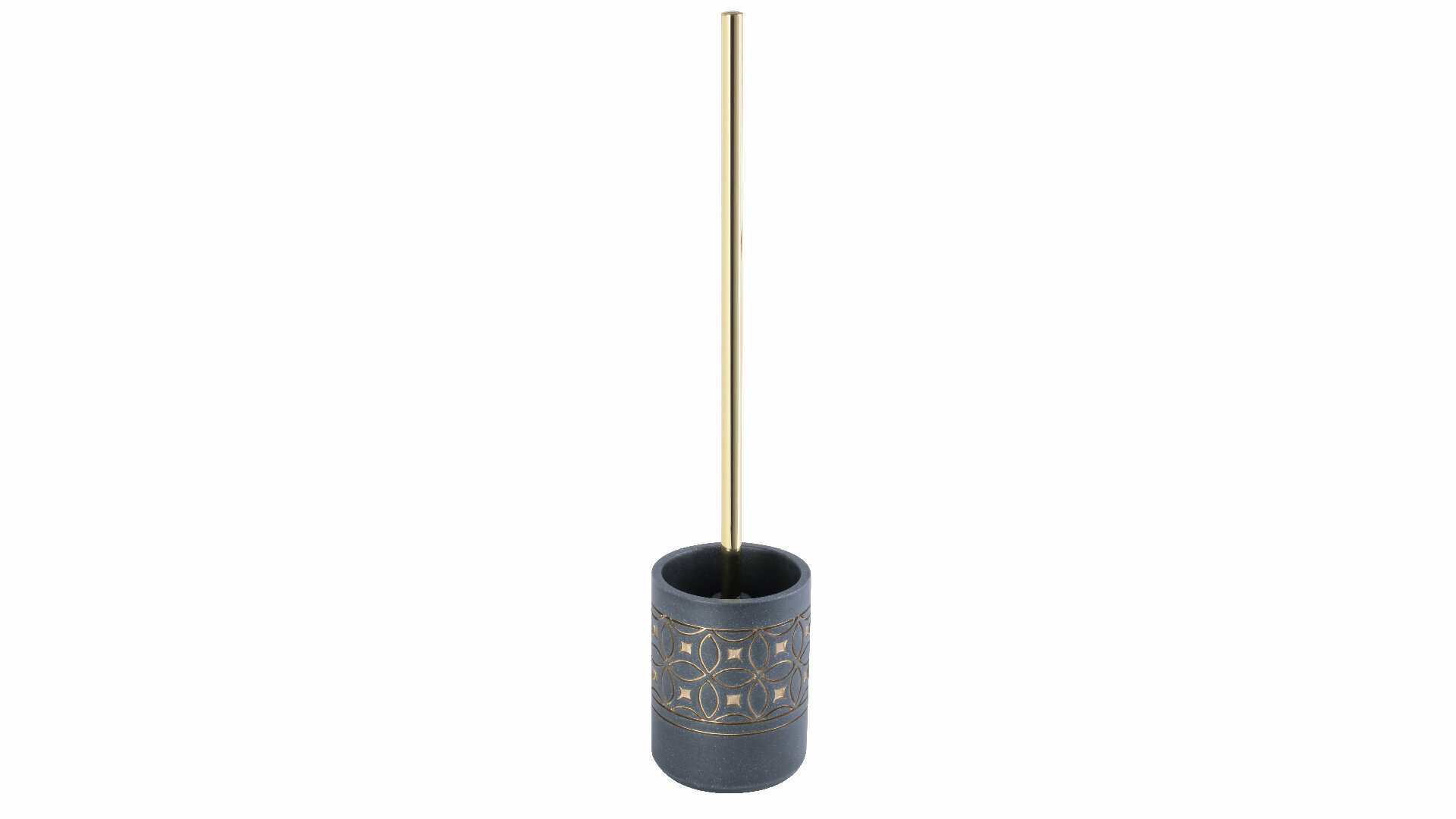 Форма подставки — цилиндрическая, поверхность матовая, цвета — серый и золотой. Аксессуар компактный, подойдет для маленького санузла.