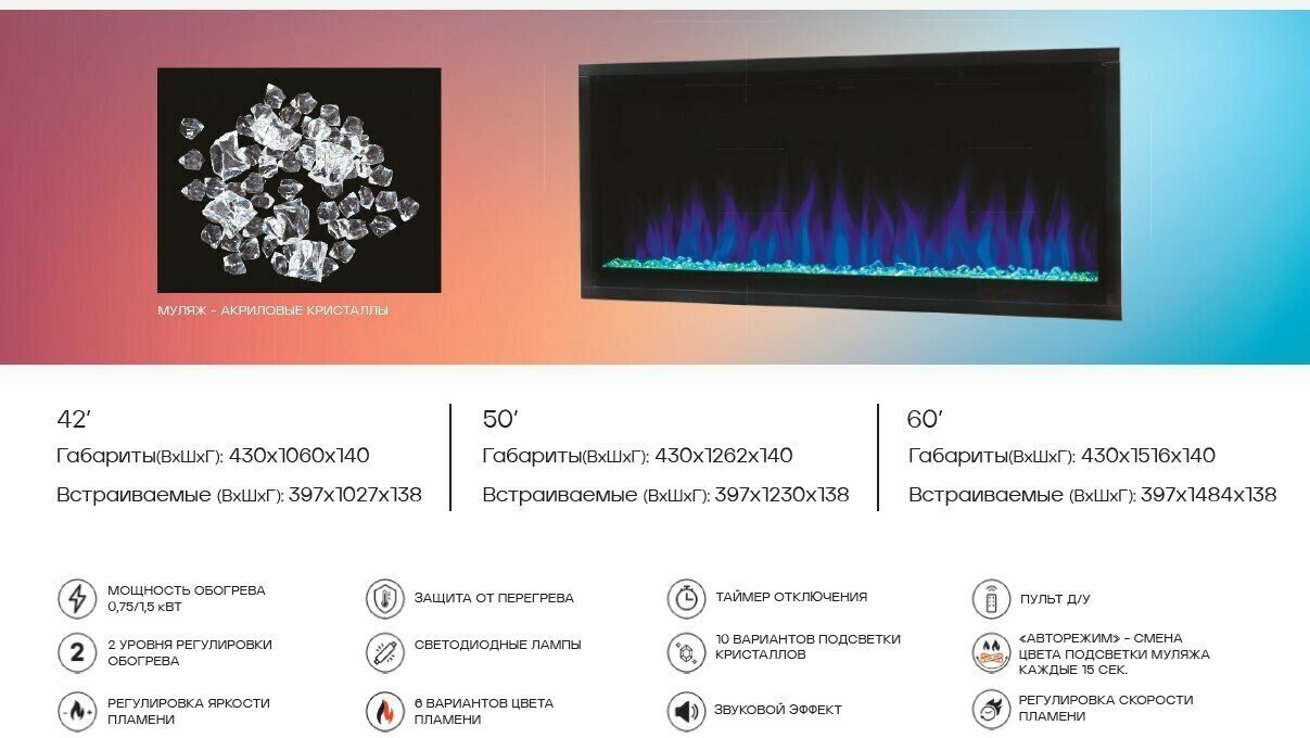 | Дополнительная информация | 2 уровня регулировки обогрева, 6 вариантов цвета пламени, 10 вариантов подсветки кристалловЗащита и безопасность |