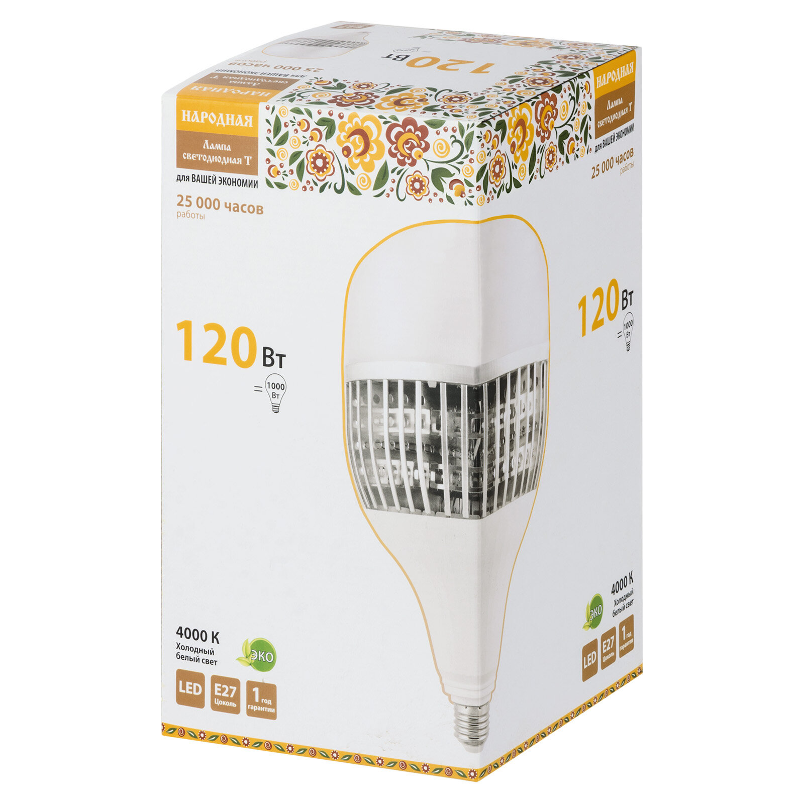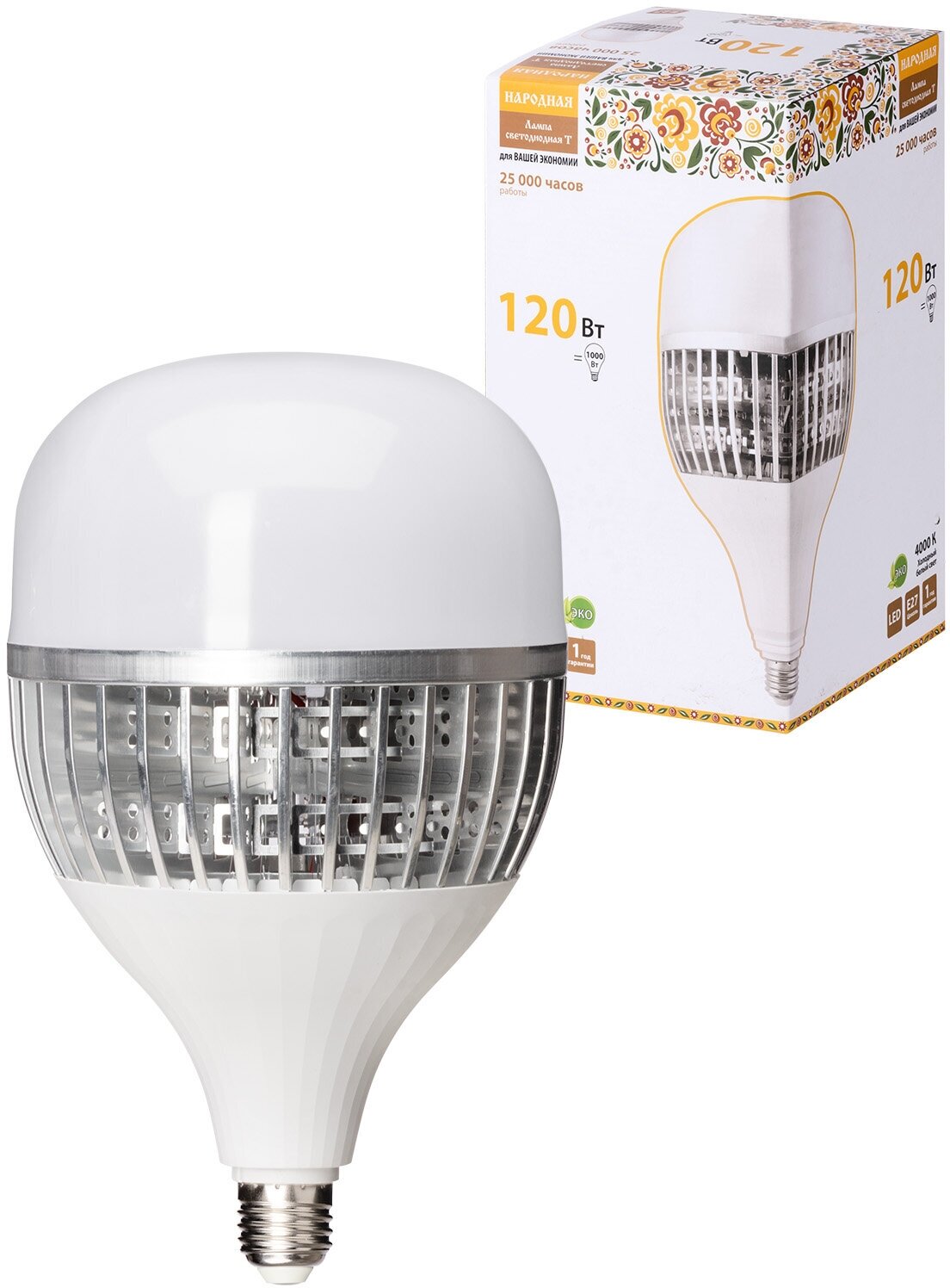 Лампа светодиодная T-120 Вт-230 В-4000 К–E27 (170x295 мм) НАРОДНАЯ - это высококачественный осветительный прибор, предназначенный для общего, местного и акцентного освещения.Энергоэффективность является одним из ключевых преимуществ данной лампы. Она обеспечивает высокую светоотдачу при минимальном потреблении энергии, что позволяет снизить затраты на электроэнергию.Матированная колба лампы исключает эффект ослепления, делая освещение комфортным и безопасным.Лампа не содержит вредных веществ и не требует специальной утилизации, что делает ее экологически безопасной.Высокая вибро- и ударопрочность лампы гарантирует ее долговечность и надежность в эксплуатации. Алюминиевый радиатор обеспечивает эффективный теплоотвод и комфортный режим работы светодиодов.Источник света лампы - светодиоды типа SMD, что обеспечивает равномерное и яркое освещение.Корпус лампы выполнен из пластика, рассеиватель - из алюминия и пластика, а радиатор - из алюминия.Лампа поставляется в коробке из картона, что обеспечивает ее сохранность при транспортировке.Мощность лампы составляет 120 Вт, напряжение - 230 В, максимальная цветовая температура - 4000 К, длина - 295 мм, диаметр - 170 мм. Срок службы лампы составляет 25 000 часов.