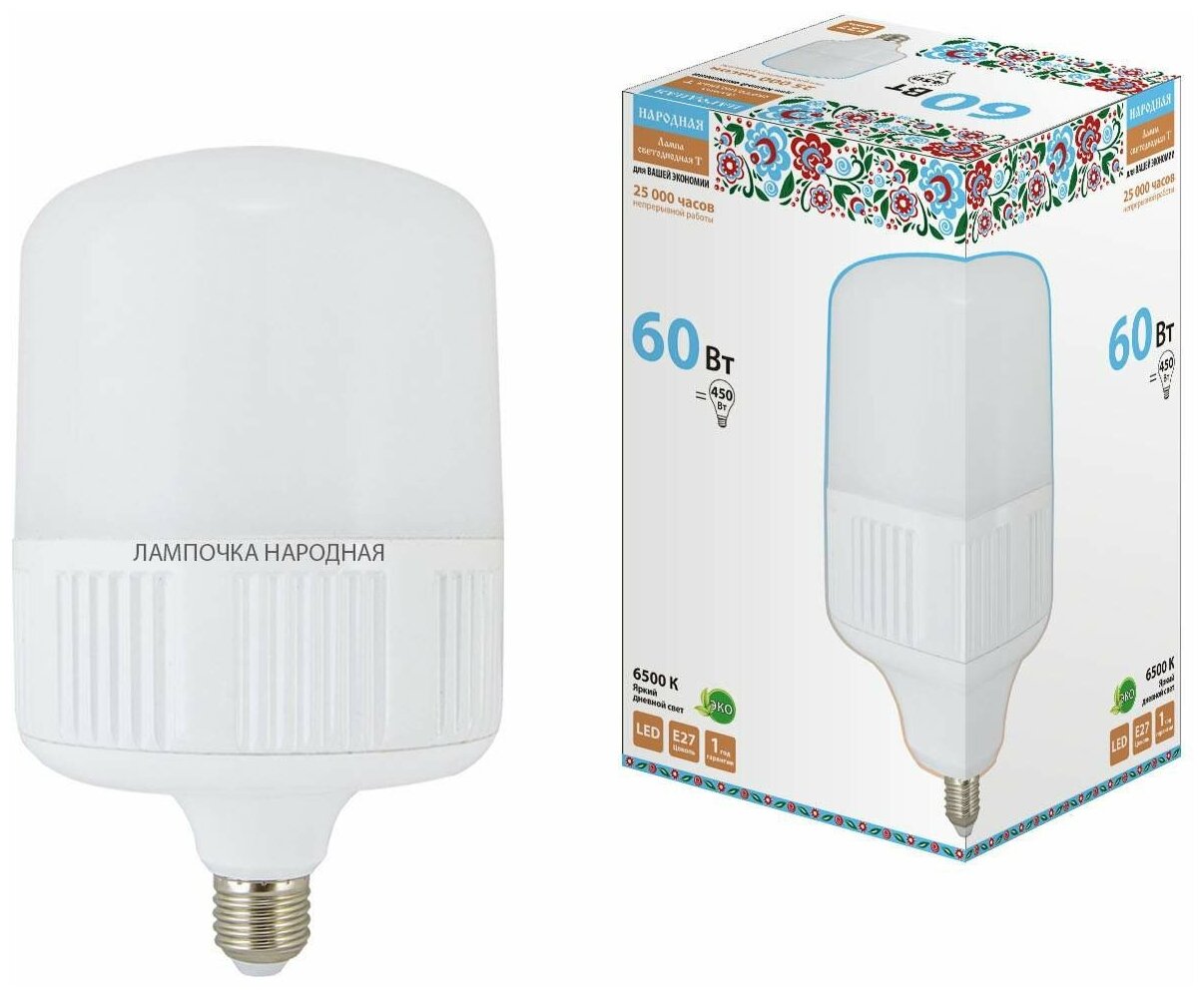 Лампа светодиодная T-60 Вт-230 В-6500 К–E27 (135x225 мм) НАРОДНАЯ – это высококачественный осветительный прибор, предназначенный для общего, местного и акцентного освещения.Энергоэффективность является одним из ключевых преимуществ данной лампы. Она обеспечивает высокую светоотдачу при минимальном потреблении энергии, что делает ее отличным выбором для экономии электроэнергии.Матированная колба лампы исключает эффект ослепления, обеспечивая комфортное освещение.Лампа не содержит вредных веществ и не требует специальной утилизации, что делает ее экологически безопасной.Высокая вибро- и ударопрочность лампы гарантирует ее долговечность и надежность в эксплуатации. Алюминиевый радиатор обеспечивает эффективный теплоотвод и комфортный режим работы светодиодов.Конструкция лампы включает источник света в виде светодиодов типа SMD.Материалы, использованные в производстве лампы, включают пластик, алюминий и рассеиватель.Упаковка лампы выполнена в виде коробки из картона, что обеспечивает безопасность и удобство при транспортировке и хранении.Мощность лампы составляет 60 Вт, напряжение – 230 В, максимальная цветовая температура – 6500 К, световой поток – 4800 лм, цвет свечения – красный, срок службы – 25 000 часов.