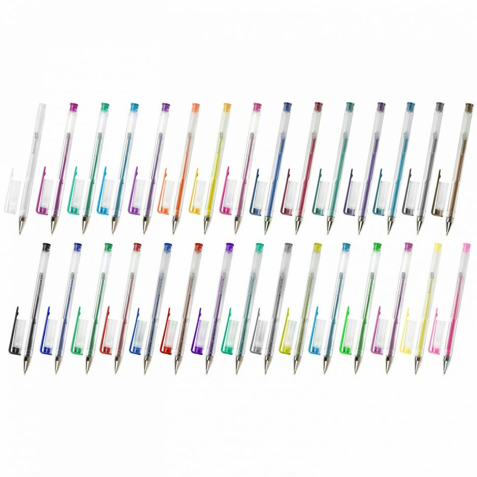 Набор включает 30 гелевых ручек: 4 ручки с классическими чернилами, 6 с блестками, 7 с эффектом металлик, 6 пастельных и 7 неоновых.
