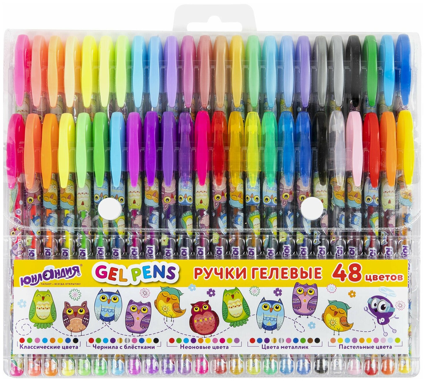 Яркая серия гелевых ручек для учебы и детского творчества. Ручка имеет круглый яркий корпус с печатью. Сменный стержень длиной 130 мм со стандартным наконечником. Диаметр пишущего узла, равный 1,0 мм, создает линию письма, равную 0,5 мм. Набор включает 48 гелевых ручек: 8 ручек с классическими чернилами, 10 с блестками, 10 с эффектом металлик, 10 пастельных и 10 неоновых:- Цвет классических чернил: чёрный, синий, красный, зеленый, розовый, жёлтый, оранжевый, голубой.- Цвет чернил с блестками: красный, зеленый, голубой, фиолетовый, золотой, серебряный, розовый, чёрный, синий, жёлтый.- Цвет чернил с эффектом металлик: красный, голубой, фиолетовый, золотой, серебряный, розовый, чёрный, коричневый, синий, зеленый.- Цвет пастельных чернил: коралловый, жёлто-зеленый, голубой, фиолетовый, оранжевый, жёлтый, розовый, нежно-розовый, нежно-голубой, салатовый.- Цвет неоновых чернил: красный, зелёный, голубой, фиолетовый, оранжевый, жёлтый, розовый, фуксия, светло-фиолетовый, салатовый.