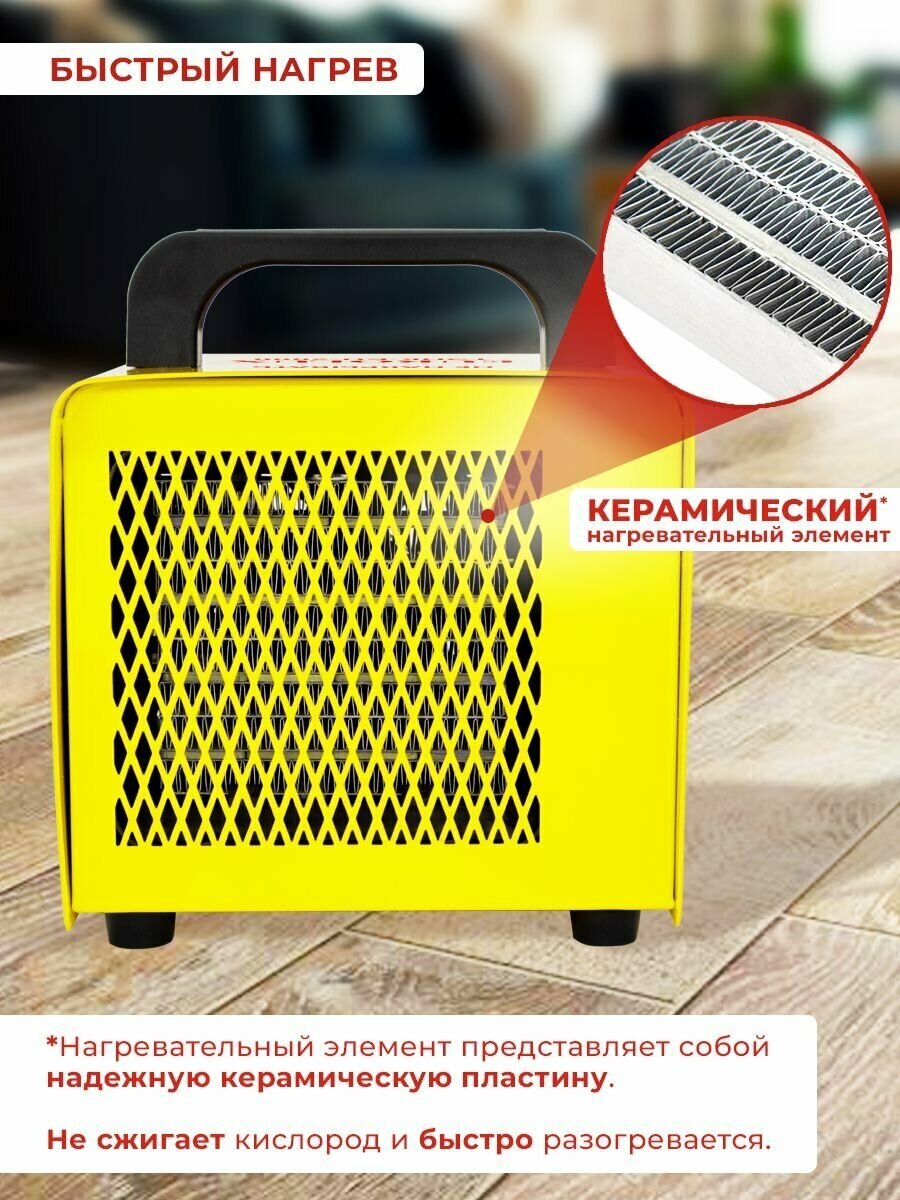 В тепловой пушке используется керамический нагревательный элемент, который отличается от открытых спиралей нагрева меньшей рабочей температурой и большей площадью, поэтому он не сжигает мелкие частицы пыли в воздухе, не выделяет вредных веществ и не сушит воздух.