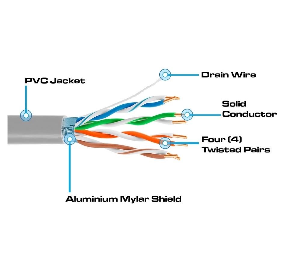 Фольгированная витая пара — присутствует один общий внешний экран в виде фольги. Экранирование обеспечивает лучшую защиту от электромагнитных наводок как внешних, так и внутренних. Экран по всей длине соединен с неизолированным дренажным проводом, который объединяет экран в случае разделения на секции при излишнем изгибе или растяжении кабеля.
