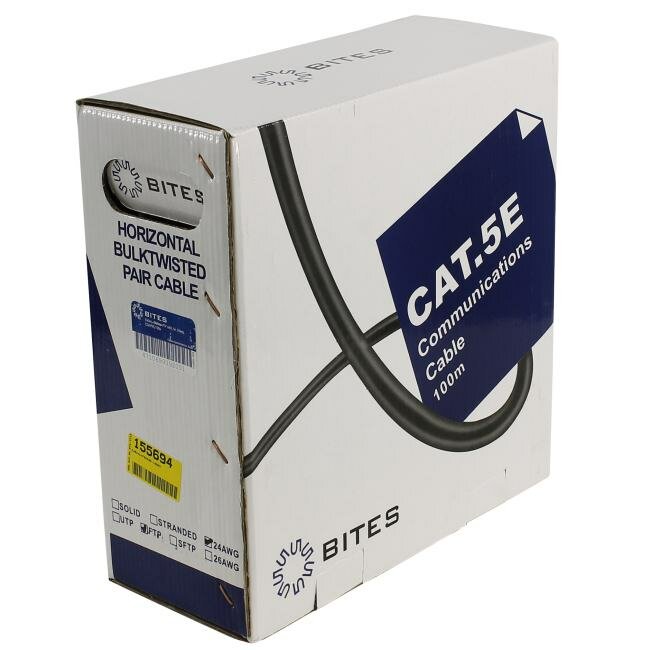 5bites FTP / SOLID / 5E / 24AWG / CCA/ PVC / 100M - экранированная витая пара категории 5е. Внутри такого кабеля 4 пары изолированных проводников (покрыты пластиковой оболочкой), скручены между собой особым способом для уменьшения электромагнитного воздействия как друг на друга, так и внешней среды. Этот кабель достаточно прочный, надежный, безопасный в использовании, и одновременно гибкий, что делает его универсальным. Кабель категории 5e является самым распространённым и используется для построения компьютерных сетей внутри помещений. Обладает общим экраном в виде фольги для защиты витых пар от внешнего электромагнитного излучения, вызываемого расположенными рядом кабелями и работающими электрическими приборами.