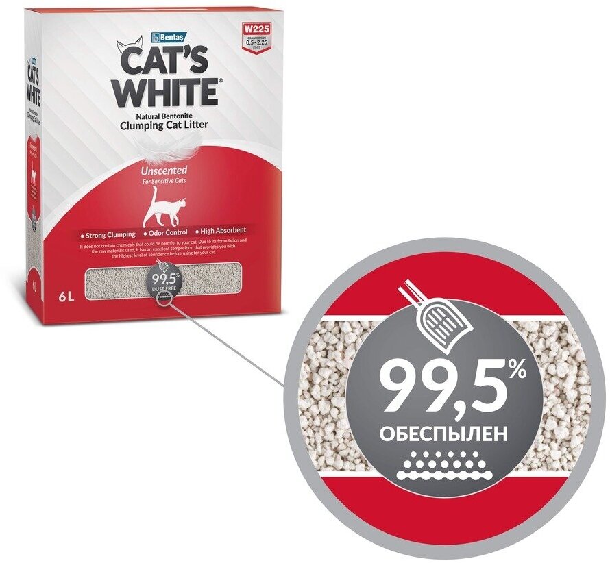 Высокая абсорбирующая способность до 300% и мгновенное образование плотного комка за 5 секунд позволяют не только быстро и надежно запирать неприятные запахи, но и сохранять наполнитель чистым. Плотные комки надежно удерживают влагу, не крошатся и легко удаляются из лотка, поэтому полная замена наполнителя не требуется. Благодаря этому Cat`s White удобен и экономичен.