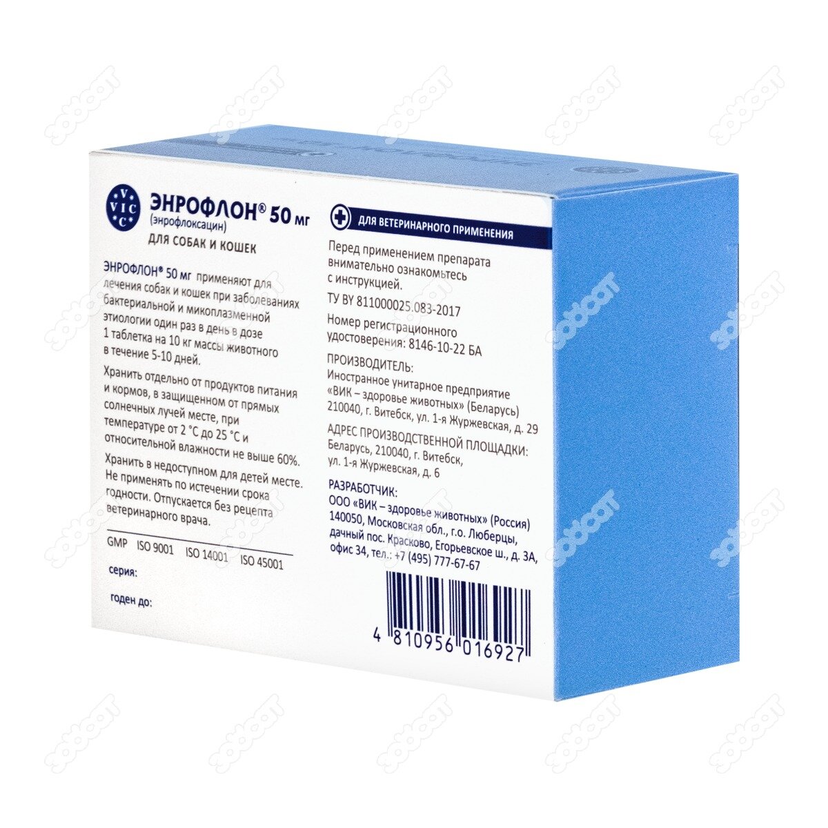 DOCTOR VIC Энрофлон 50мг для лечения собак и кошек при желудочно-кишечных респираторных заболеваниях патологии мочеполовой системы поражении мягких тканей и кожи отитов инфицированных ранах и др