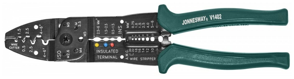 Обжиматель контактов Jonnesway V1402 профессиональный 8 в 1 V1402 для снятия изоляции и обжима наконечников, 250 мм