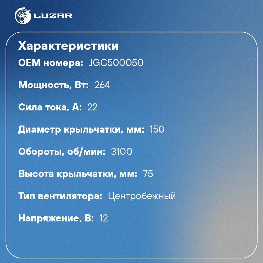 Вентилятор отопителя LUZAR обеспечивает максимально быструю циркуляцию воздуха. Вентиляторы состоят из электрического привода и пластиковой крыльчатки, устанавливаются в корпус отопителя в салоне автомобиля. У вентиляторов отопителя усовершенствованная конструкция лопастей вентилятора для высокой скорости работы и подачи большего объема воздуха. У вентиляторов отопителя откалиброваная крыльчатка, поэтому уровень шума до 50% ниже, чем у аналогов. Вал электродвигателя вентиляторов LUZAR имеют два плавающих подшипника, что снижает трение и исключает биение вала.