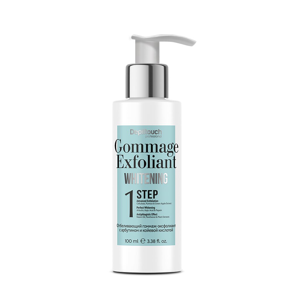 Деликатный гоммаж-эксфолиант содержит мягкий натуральный абразив, отшелушивает ороговевшие клетки, эффективно очищает, повышает тонус кожи, имеет осветляющее и выравнивающее действие. Применяется в начале процедуры отбеливания кожи и для профилактики гиперкератоза. Особенность гоммажа в том, что его можно применять в т.ч. для деликатных областей кожи, а арбутин уже будет работать, оказывая осветляющее действие, которое еще более усилится после применения эмульсии и крема. Эффективнее в применении вместе с другими средствами Depiltouch Whitening, является первым шагом системы по отбеливанию кожи.