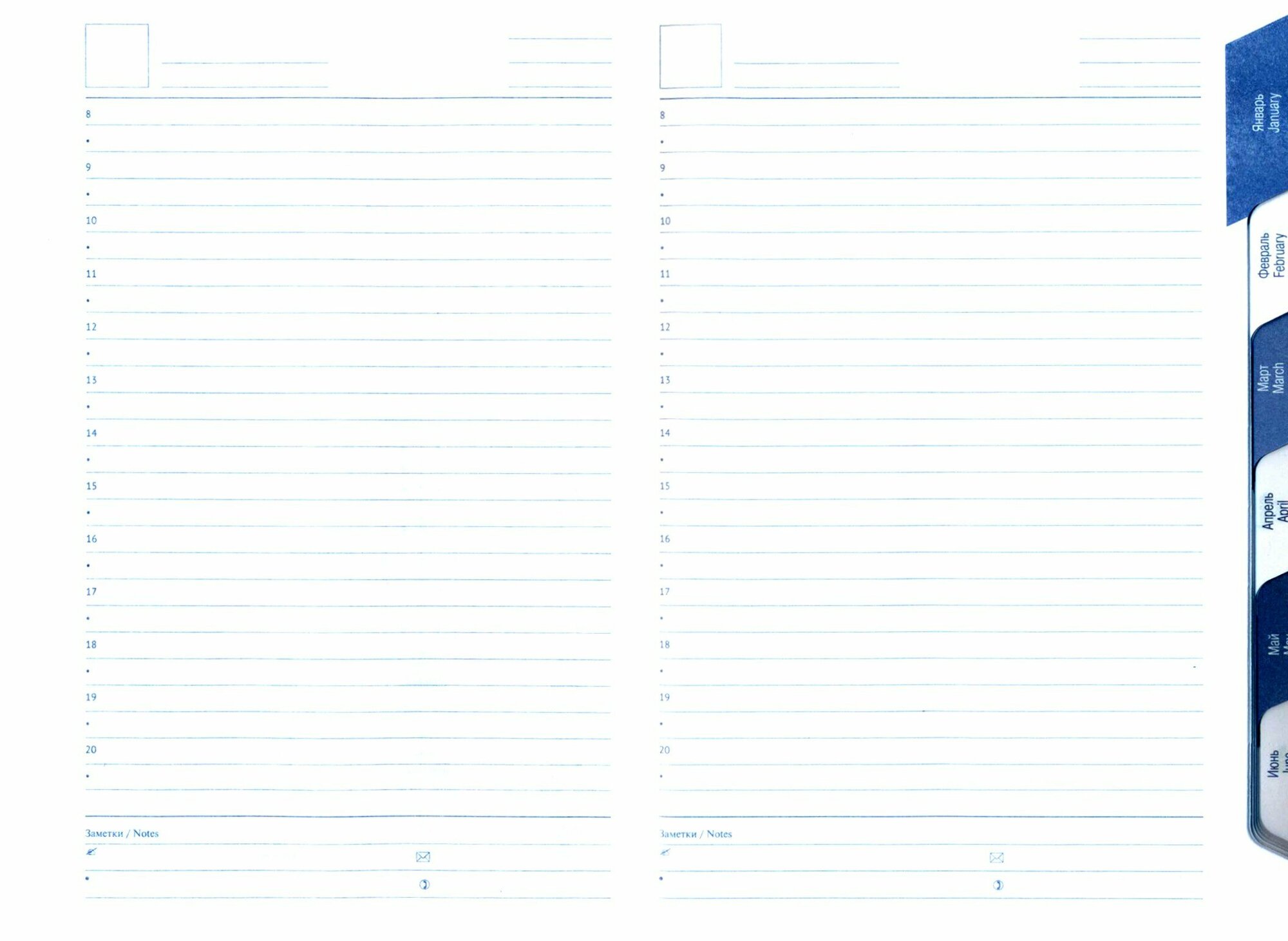 Информационно-справочный блок включает календарь, международные и внутрироссийские телефонные коды, размеры одежды, праздничные даты. Почасовая разбивка дня для максимально точного планирования. День и месяц проставляется вручную. Строгая архитектура, печать в одну краску - голубым цветом. Высечка.