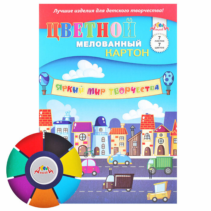 Цветной мелованный картон 7 листов, 7 цветов ТМ Апплика. Листы изготовлены из мелованного картона. В наборе яркие глянцевые цвета: красный, зеленый, желтый, оранжевый,