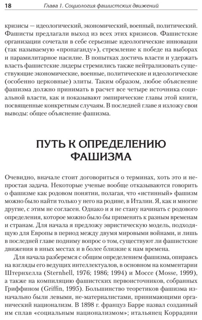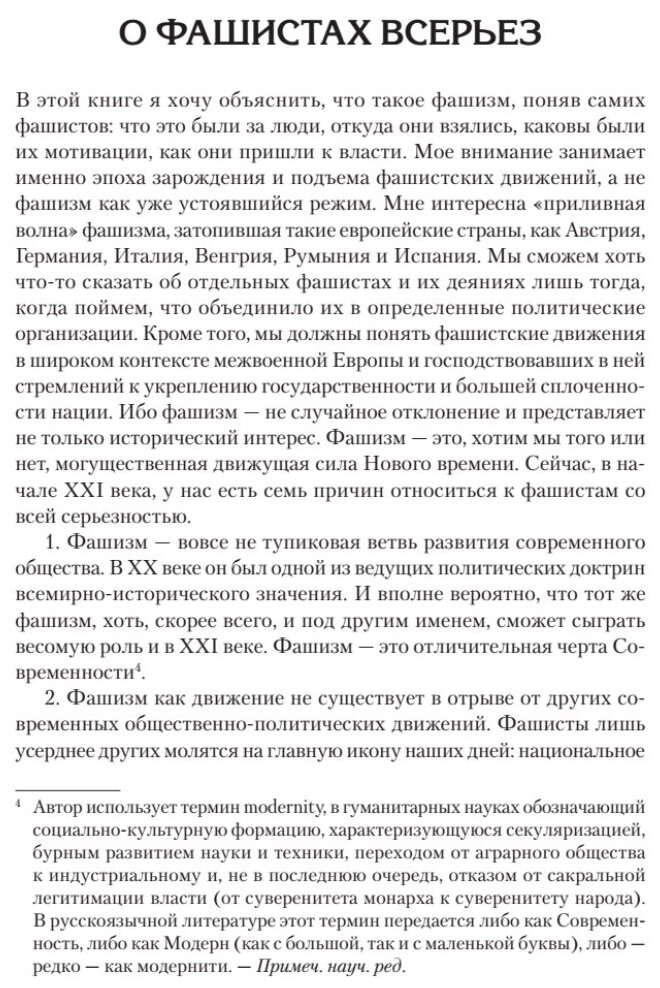 Раньше слово "фашизм" ассоциировалось в основном только с Второй мировой войной, и, казалось бы, и заканчивалось на этой теме. Автор рассматривает всю историю фашизма. Для начала он рассказывает о фашизме, как о идеологии, культуре с определёнными ценностями. Далее фашистами будут честно названы те преступники, которые зверски исполняли этнические чистки. В книге рассказывается о зарождении фашизма, о его росте, прогрессе, об особенностях в разных странах. Конечно речь идет о Европе: Италия, Германия, Австрия, Венгрия, Румыния, Испания. Автор проводит анализ того, почему же так все таки произошло, и почему, казалось бы, целыми странами, которые сейчас считаются демократичными и либеральными, овладел фашизм, который ранее был только в сектах и группировках. Все это имеет свою связь с Первой мировой войной и кризисами, которые за ней последовали. Вопрос о насущном ждет вас в конце. Можем ли мы себе вообще представить, что в нашем современном обществе, фашизм снова может прийти к власти. Фашизм не умер. Некоторые проявления фашизма можно увидеть в мире и сейчас. Кто-то романтизирует бывших лидеров этого движения, а кто-то и вовсе делает "новых фашистов" народными героями. Автор заканчивает свою книгу тем, что фашизм, в привычном смысле слова, далек от воскрешения, однако, я думаю, что многие не согласятся. Военные действия, ограничения и давление, которые некоторые на себе ощущают, означают и ведут именно к фашизму и национализму, какими бы терминами и целями они не прикрывались.