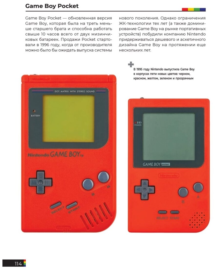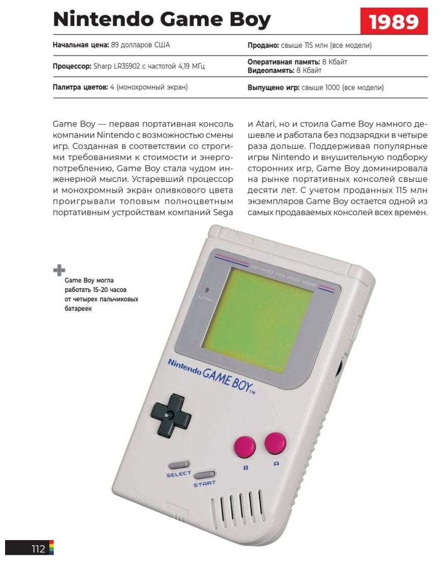 Книга очень понравилась. Оформление достойное (твёрдая обложка, приятные на ощупь страницы), содержание очень обрадовало. В книге представлено много видов игровых консолей, с самых первых (первое поколение) до практически самых новейших (девятое поколение). Развёрнутый рассказ о каждой консоле, представлены фото самих моделей, их вариаций, а также сами консоли в "разрезе". Очень хорошая книга для тех, кто интересуется разнообразием игровых консолей.