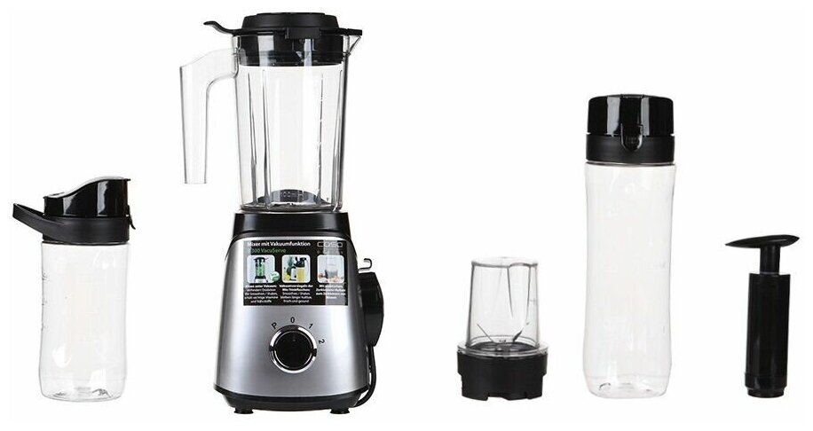 В комплекте к CASO B 300 идет сразу три емкости для смешивания объемом 700, 600 и 400 мл. Готовьте сразу несколько полезных напитков, теперь у вас для этого будет всё необходимое. Используйте большую чашу блендера для приготовления смузи, коктейлей, перемешивания и измельчения ингредиентов для соусов и салатов. Делайте фруктовое, овощное или ягодное пюре, заголовки для варенья и многое другое.Хотите сохранить вкус и запах еды надолго? Откачайте воздух из бутылок 600 и 400 мл через вакуумные крышки, процесс окисления существенно замедлится и содержимое дольше будет оставаться свежим, как буд-то вы сделали его совсем недавно. В комплекте также идёт удобный неопреновый чехол, он дополнительно защитит содержимое большой бутылки от ультрафиолетового излучения.Хотите перемолоть специи или орехи? Используйте для этого отдельную небольшую насадку. При этом вы легко можете регулировать степень помола, чем дольше работает блендер CASO B300 - тем мельче будут частицы.Корпус устройства выполнен из качественной нержавеющей стали. Блендер оснащен четырьмя лезвиями. Оборудование надежно удерживается на столе благодаря прорезиненным ножкам