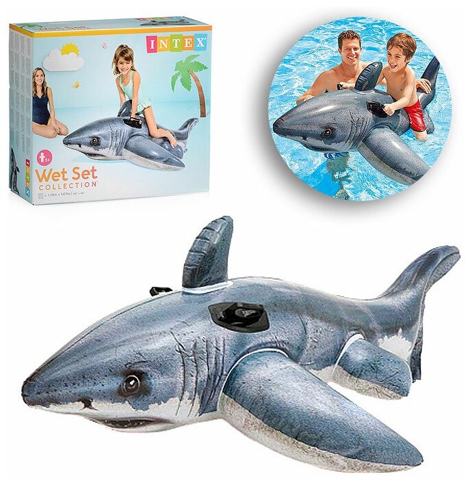 Игрушка для катания по воде Intex Белая акула поднялась из морских глубин прямиком в бассейн для того, чтобы стать верным спутником малыша в веселых забавах! обитательница водной стихии уже подготовила свою спинку для того, чтобы кроха поскорее забрался и отправился навстречу задорным брызгам и увлекательному катанию на воде. Специальные ручки на тельце акулы помогут ребенку надежно держаться во время игры.