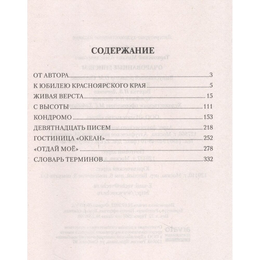 Открывает книгу новая повесть "Живая верста". Это автобиографическое повествование словно предваряет последующее содержание книги. Действие "Живой версты" начинается в 1974 году в Туве, где писатель работал после девятого класса в противочумной экспедиции и где с первого взгляда на Саянские горы остался навсегда очарованным Енисеем.