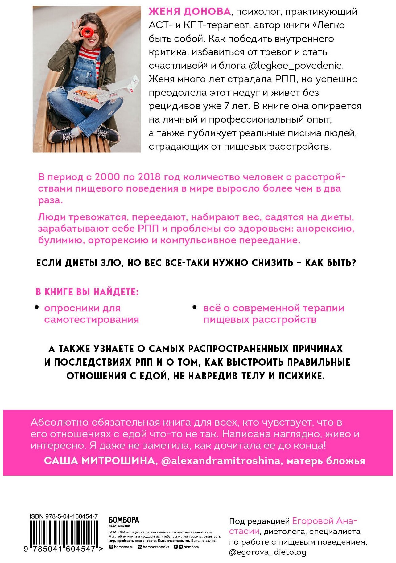 В век пищевого изобилия, когда нам доступны любые продукты, а найти информацию о правильном питании не составляет труда, люди все равно продолжают страдать от различных пищевых расстройств. Из новой книги практикующего психолога Жени Доновой вы узнаете, откуда берется недовольство собственным телом, какие самые распространенные причины и последствия РПП, что считается нормой, а что тревожным звоночком, какая терапия пищевых расстройств применима сегодня. Вы поймете, как выстроить правильные отношения с едой, не навредив телу и психике.