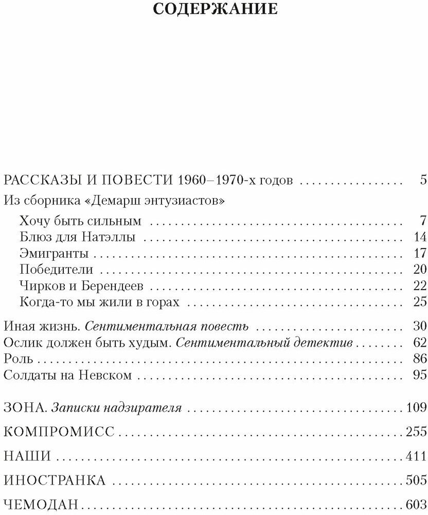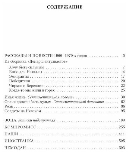 Сергей Довлатов — один из самых популярных и читаемых русских писателей конца ХХ века, и он «обречен» оставаться таким еще долгое время. Его произведения — та самая великая классика, которая, при всей своей значимости, остается интересной и близкой читателям, независимо от возраста, национальности, эрудиции или, говоря словами самого Довлатова, «степени интеллектуальной придирчивости». Лев Лосев сформулировал это качество довлатовской прозы так: «Довлатов знал секрет, как писать интересно». В настоящее издание вошли ранние рассказы и повести Довлатова, а также широко известные и любимые произведения: «Зона», «Компромисс», «Наши», «Иностранка» и «Чемодан».