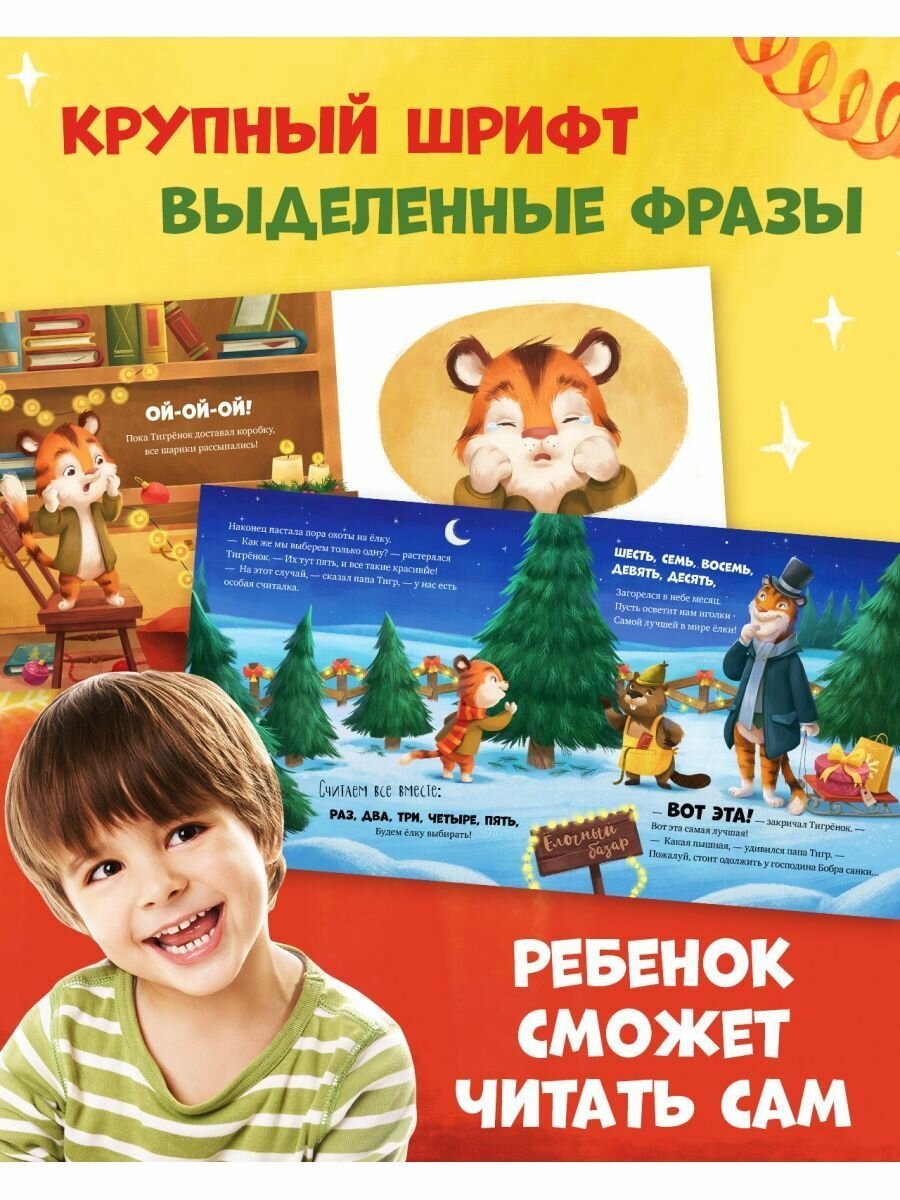 Читайте с малышом сказку «Как Тигренок охотился на Новый год» и выполняйте интерактивные задания: порычать с Тигренком для храбрости, отыскать самую пушистую елку, без ошибок сосчитать до двенадцати, найти все красные елочные шары на картинке.