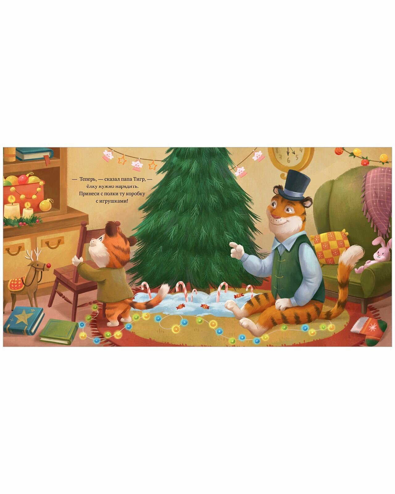 Тигренок уже большой, и в этом году он вместе с папой идет на охоту за Новым годом. Герои найдут родным подарки, побывают в кондитерской госпожи Косули, выберут на елочном базаре самую пышную елку, украсят дом и, наконец, встретят Новый год под бой часов. Чтобы помочь Тигренку, нужно смазать пальчиком торт на картинке, проговорить считалку-выбиралку, развеселить полосатого друга.