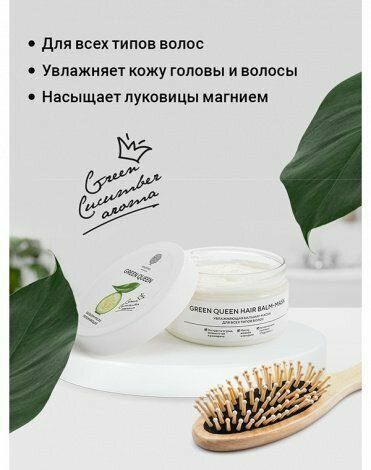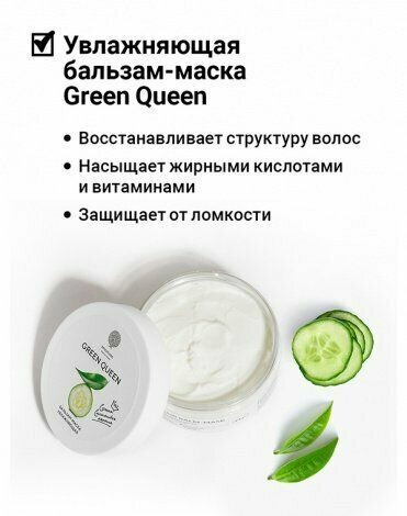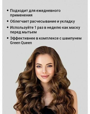 Наносить на чистые влажные волосы на 3-5 минут, смыть водой. Подходит для ежедневного использования. Эффективнее в комплексе с шампунем Green Queen shampoo.