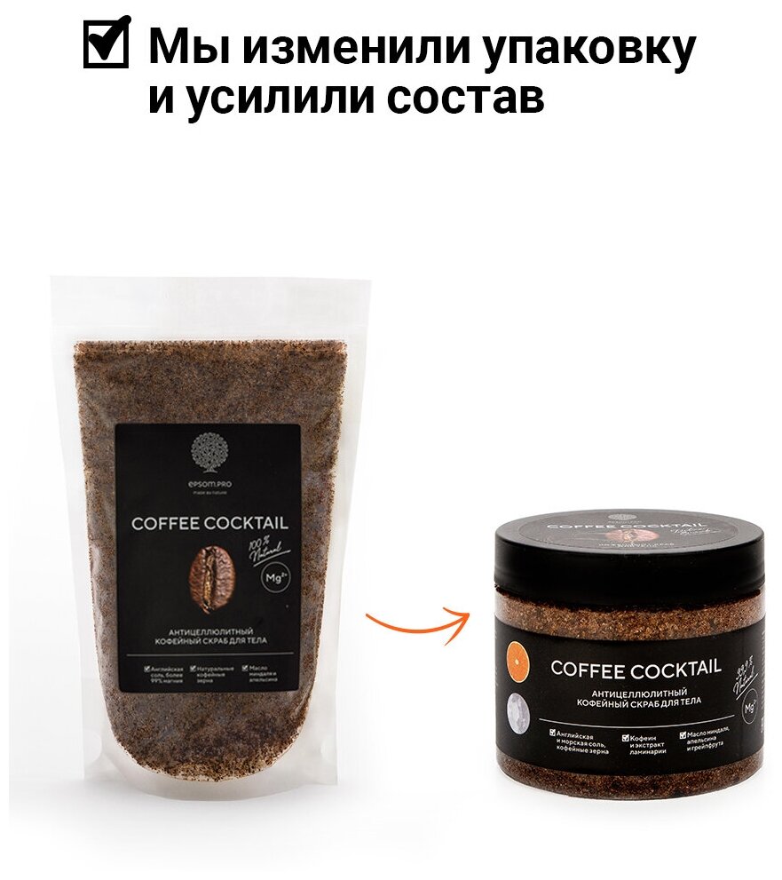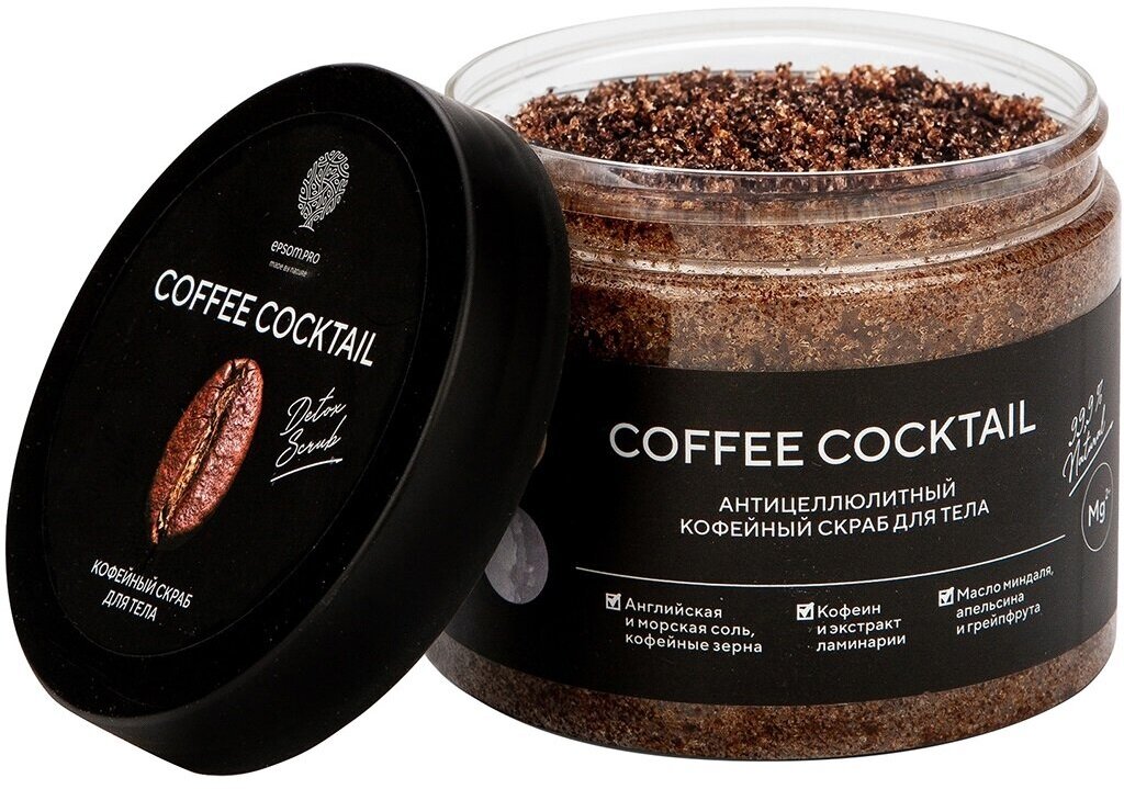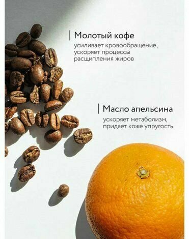 Антицеллюлитный скраб для тела на основе английской, морской соли и молотых кофейных зёрен бережно отшелушивает ороговевшие клетки, делая кожу гладкой, и помогает справляться с отеками, регулируя лимфодренажную систему организма и усиливая циркуляцию крови. Масло миндаля, апельсина и грейпфрута питает и увлажняет клетки кожи, способствуя синтезу коллагена. Экстракт ламинарии и зеленых кофейных зерен уменьшают проявления целлюлита и способствуют регенерации клеток кожи. Комплекс этих ингредиентов разглаживают мелкие неровности и возвращают коже эластичность.