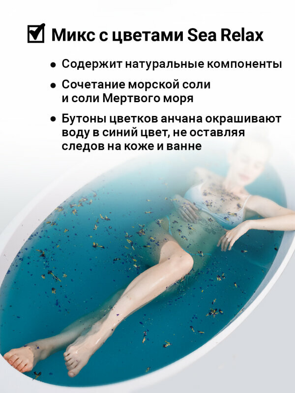 Sea Relax - это микс соли Мёртвого и Средиземного морей, который окрашивает воду в лазурный цвет благодаря цветам анчана и васильков, и наполняет ванную комнату расслабляющим ароматом лимона, мяты и зеленого чая. Полный релакс без искусственных красителей!