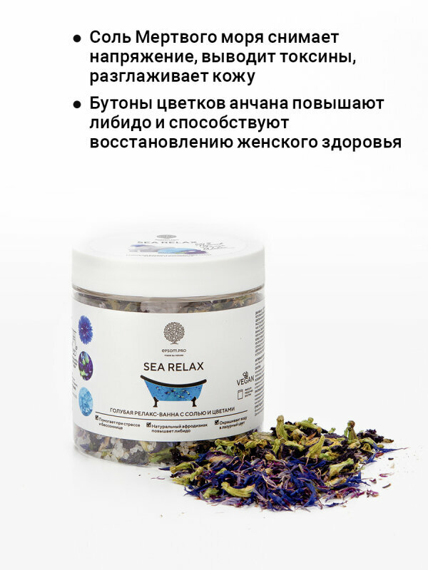 Ванна с Sea Relax снимает физическое и эмоциональное напряжение, способствует обновлению клеток кожи, повышает ее упругость, выводит шлаки и токсины из организма. Лепестки василька помогают снизить отечность и разгладить мелкие морщинки, а бутоны цветков анчана являются древним афродизиаком и способствуют повышению либидо.