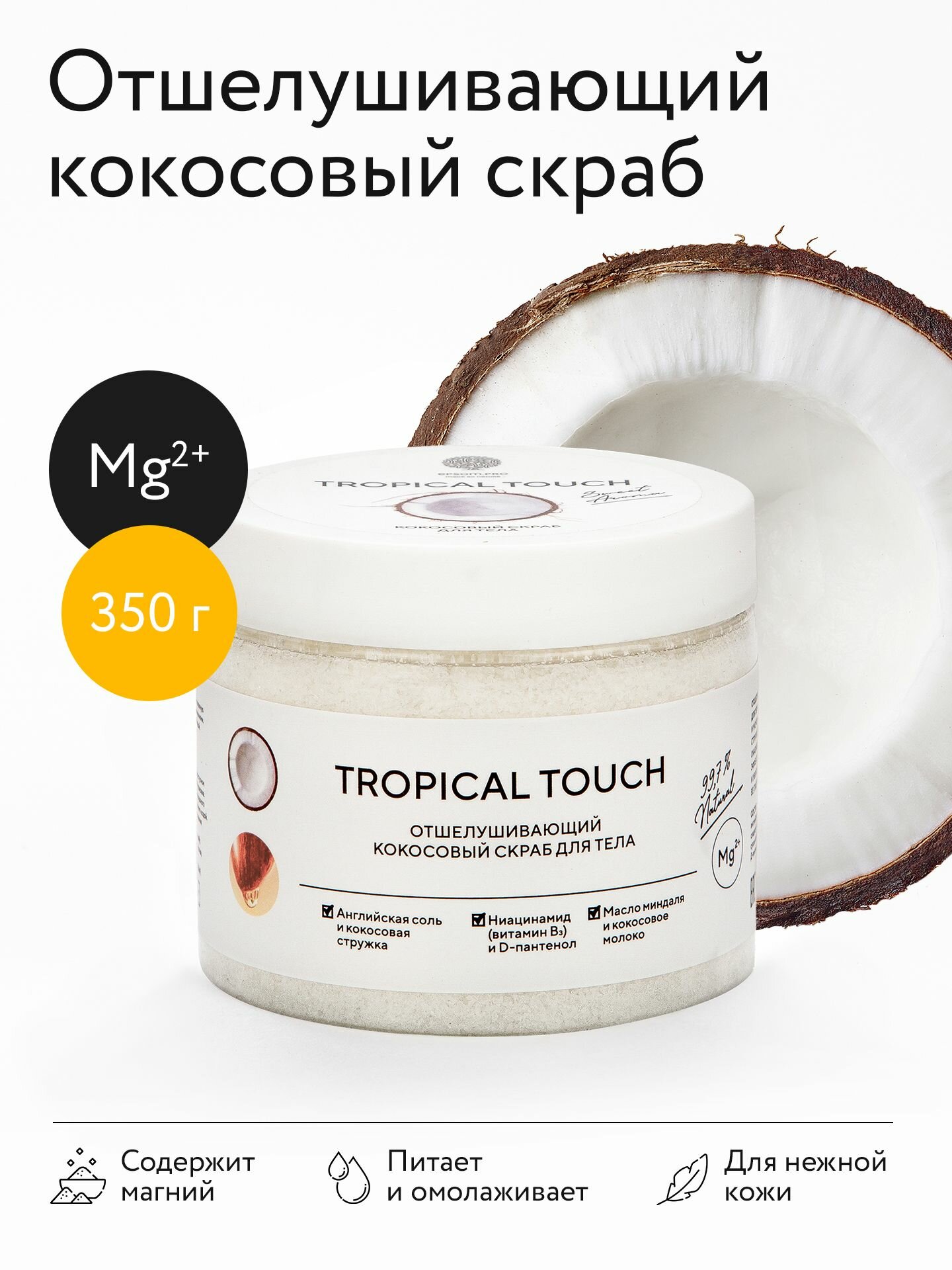Скраб для тела на основе английской и морской соли с нежным ароматом кокоса деликатно очищает и питает кожу, улучшает кровообращение, запускает процесс регенерации клеток и тонизирует кожный покров. Органические компоненты отвечаюти за увлажнение и омоложение: кокосовая стружка и молоко восстанавливают естественную красоту кожи, а масло сладкого миндаля придает свежесть и упругость. Ниацинамид и д-пантенол способствуют синтезу коллагена и выработку керамидов, успокаивают кожу, способствуют её увлажнению, проникая в глубокие слои эпидермиса.
