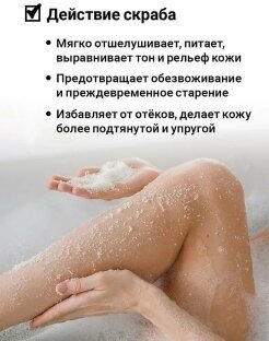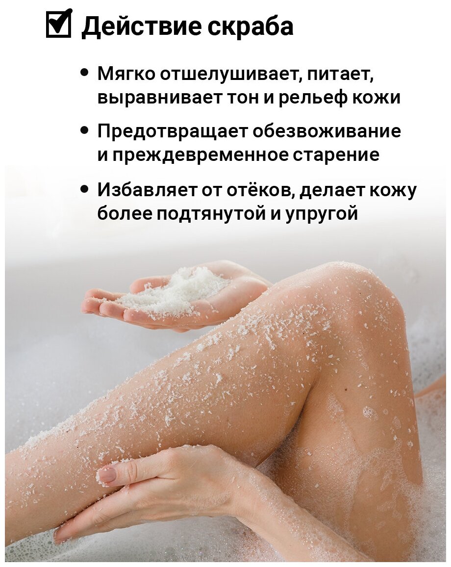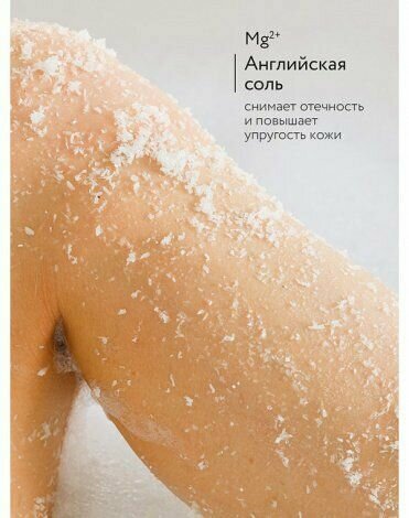 Состав: английская соль, морская соль, кокосовая стружка, сухое кокосовое молоко, масло сладкого миндаля, ниацинамид, D-пантенол.