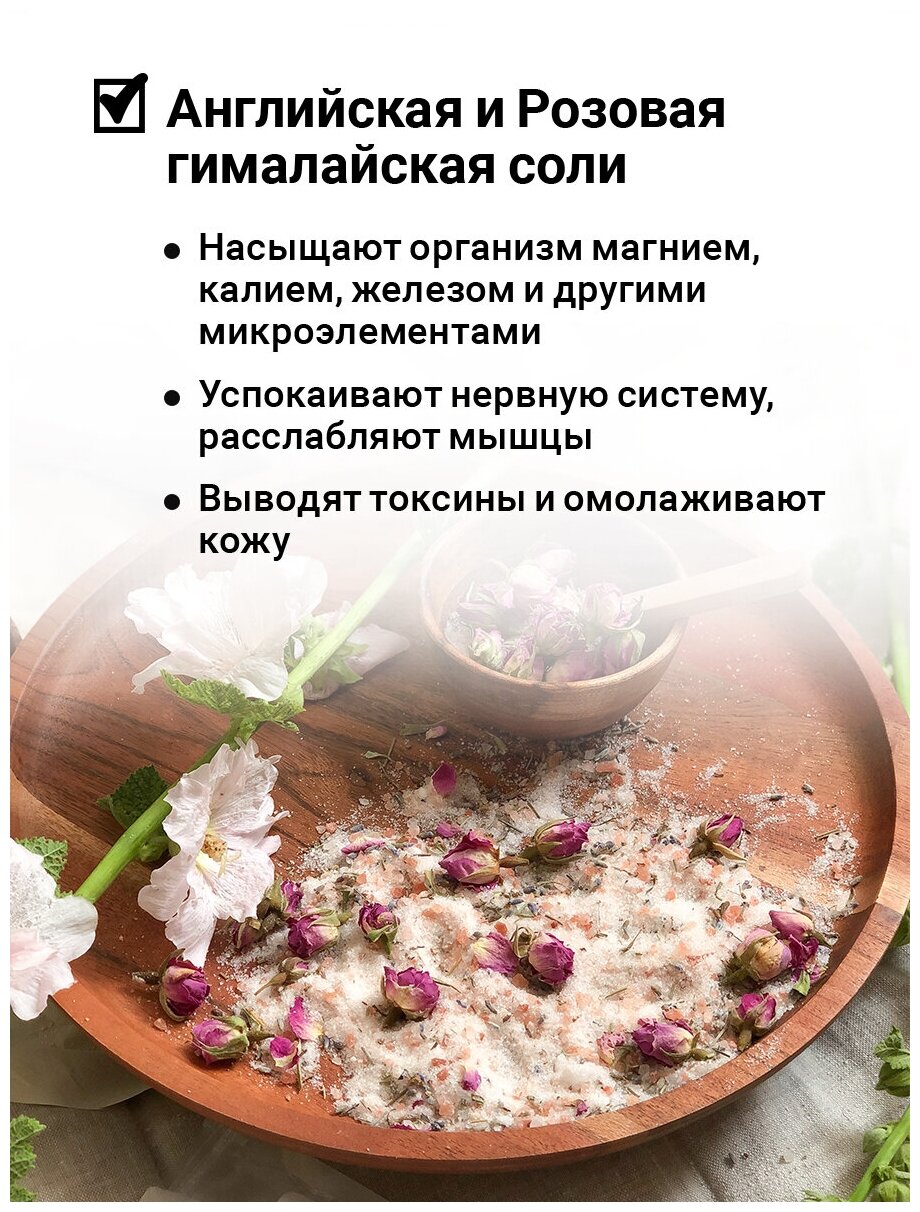 Состав: английская соль, розовая гималайская соль, цветы лаванды, бутоны чайной розы.