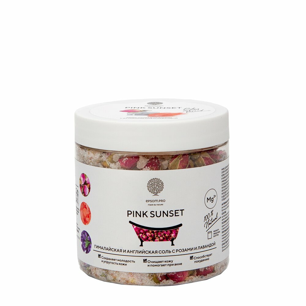 Микс для ванной Pink Sunset помогает расслабить тело, снять нервное напряжение и сделать кожу красивой и здоровой. Английская соль в сочетании с ароматом лаванды и чайной розы успокаивает нервы и расслабляет, восстанавливает водно-солевой баланс и снимает отёчность. Розовая гималайская соль насыщает кожу минералами, заботится о здоровье и красоте волос и кожи, сохраняя ее молодой и упругой. Бутоны розы и цветки лаванды, раскрываясь в воде, создают атмосферу изысканного расслабления.