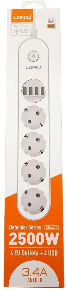 LDNIO SE4432 — сетевой удлинитель на четыре розетки и с четырьмя разъемами USB. Относится к разряду вещей, которые необходимо иметь дома и на работе, с его помощью можно безопасно запитать электроприборы, а также максимально быстро зарядить аккумуляторы мобильных устройств или обеспечить работу гаджетов от разъема USB. Четыре USB разъема обладают интеллектуальной функцией определения характеристик аккумулятора у подключенных устройств, в зависимости от которых регулируется подача тока до 3.4А (макс). Данный факт обеспечивает эффективную и максимально быструю зарядку подключенных устройств. Снизу на сетевом удлинителе LDNIO SE4432 предусмотрены мягкие нескользящие накладки, которые придают устойчивости даже на гладкой, полированной поверхности, и защищают ее от появления царапин и мелких повреждений. Четыре евророзетки с заземлением, повернутые вокруг своей оси на 45 градусов, дают возможность одновременно запитать четыре электроприбора с суммарной, потребляемой мощностью до 2500 Вт при 10 А.