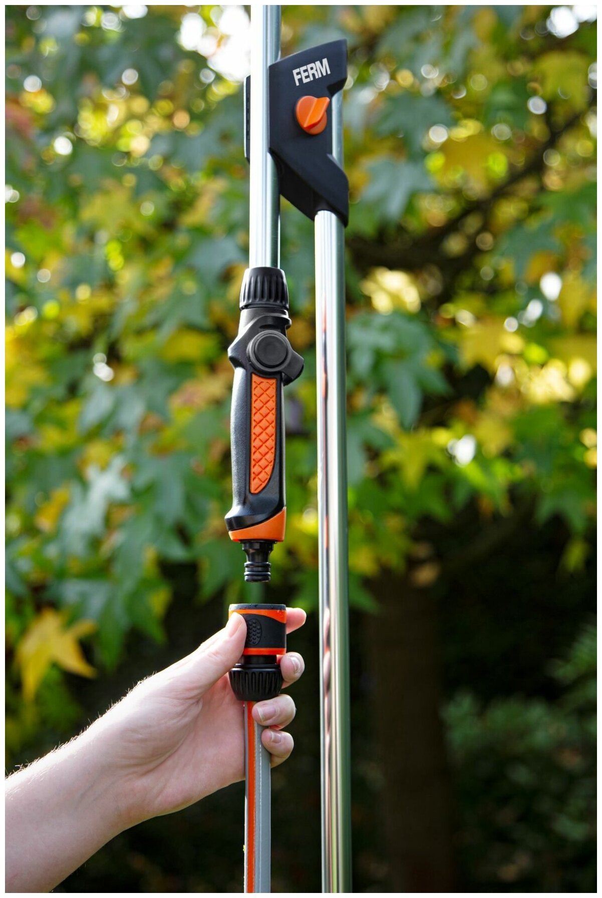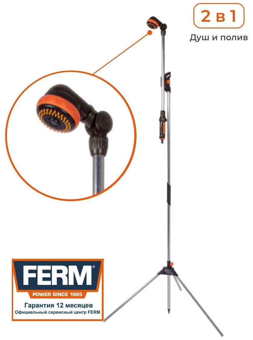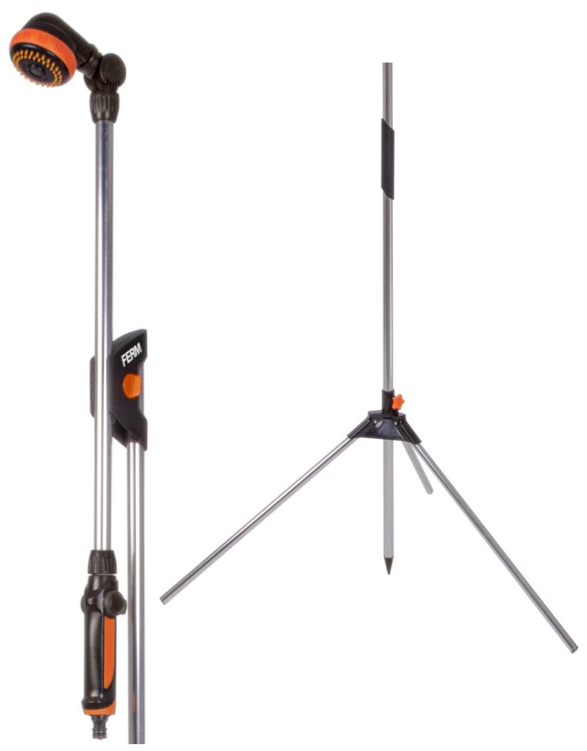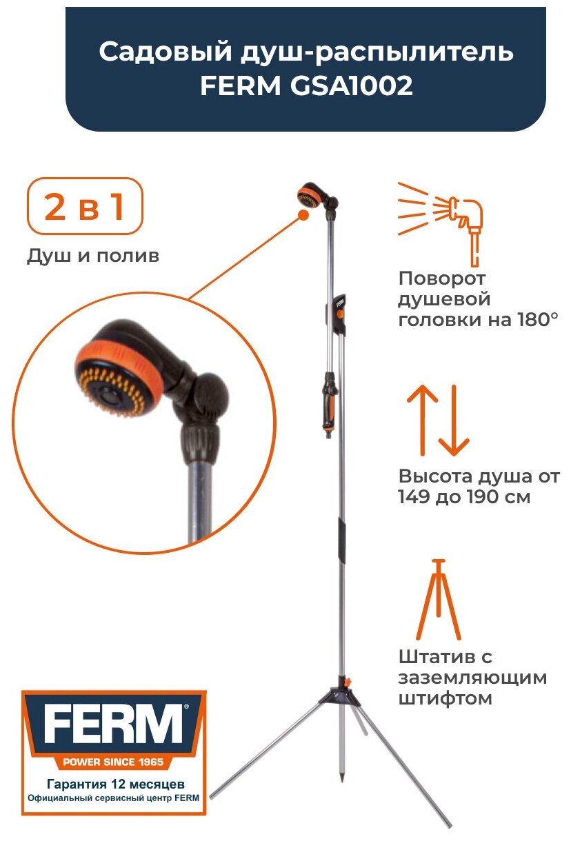 Многофункциональный садовый душ-распылитель FERM GSA1002 позволяет не только принять душ на улице, но и благодаря съемной штанге можно полить садовый участок. Душ легко разместить в любом удобном месте благодаря стойке штатива. Конструкция обеспечивает легкий монтаж и стабильную устойчивость в саду, на газоне или в песке. Легкое подключение садового шланга позволит наслаждаться использованием душа для ваших потребностей! Душ имеет удобную регулировку душевой головки поворотом на 180° и три различных режима распыления. В конструкции душа предусмотрена возможность регулирования высоты от 149 до 190 см благодаря поворотной ручке на штанге штатива. Это очень удобно при поливе растений в труднодоступных местах или при мытье крупного автомобиля.