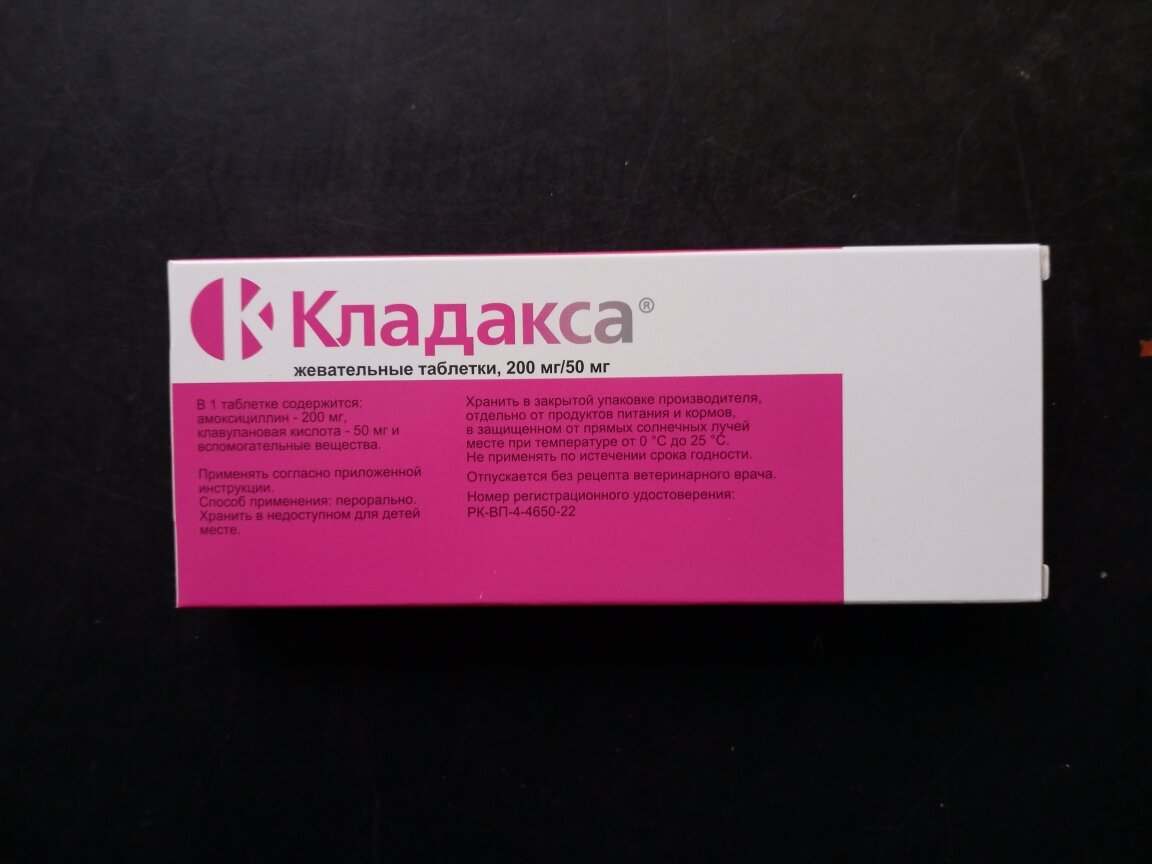 КЛАДАКСА жевательные таблетки — комбинированный антибактериальный препарат, содержащий амоксициллин и клавулановую кислоту. Применяется для лечения инфекций кожи (включая глубокую и поверхностную пиодерму), мочевыводящих путей, респираторных инфекций, бактериальных энтеритов и других инфекционных заболеваний собак и кошек бактериальной этиологии. Применяется для лечения бактериальных инфекций. Применяется без ограничений по возрасту и весу.