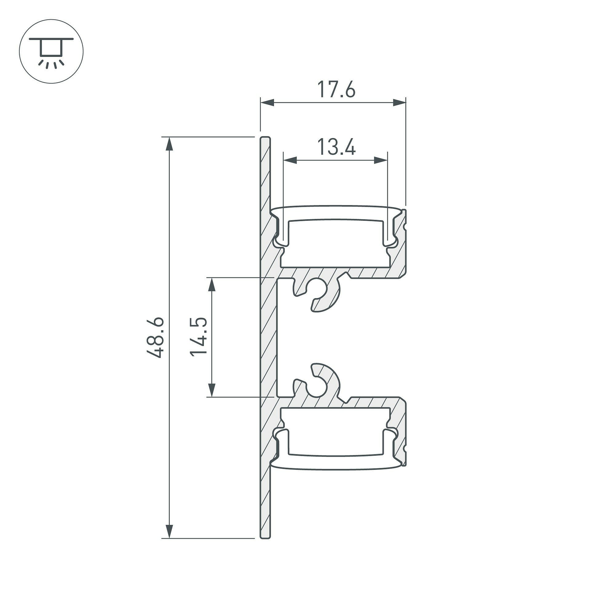 Накладной настенный профиль из анодированного алюминия с двусторонним свечением для создания эффекта «отраженного света» идеально подходит для подсветки стен. Габаритные размеры профиля составляют 2000 мм в длину, 17,6 мм в ширину и 48,6 мм в высоту. Площадки для установки светодиодных лент позволяют использовать ленты шириной до 13 мм и мощностью до 31 Вт/м. Это обеспечивает гибкость в выборе светодиодных лент и создает потрясающие световые решения. Отличное решение для создания современных световых проектов.