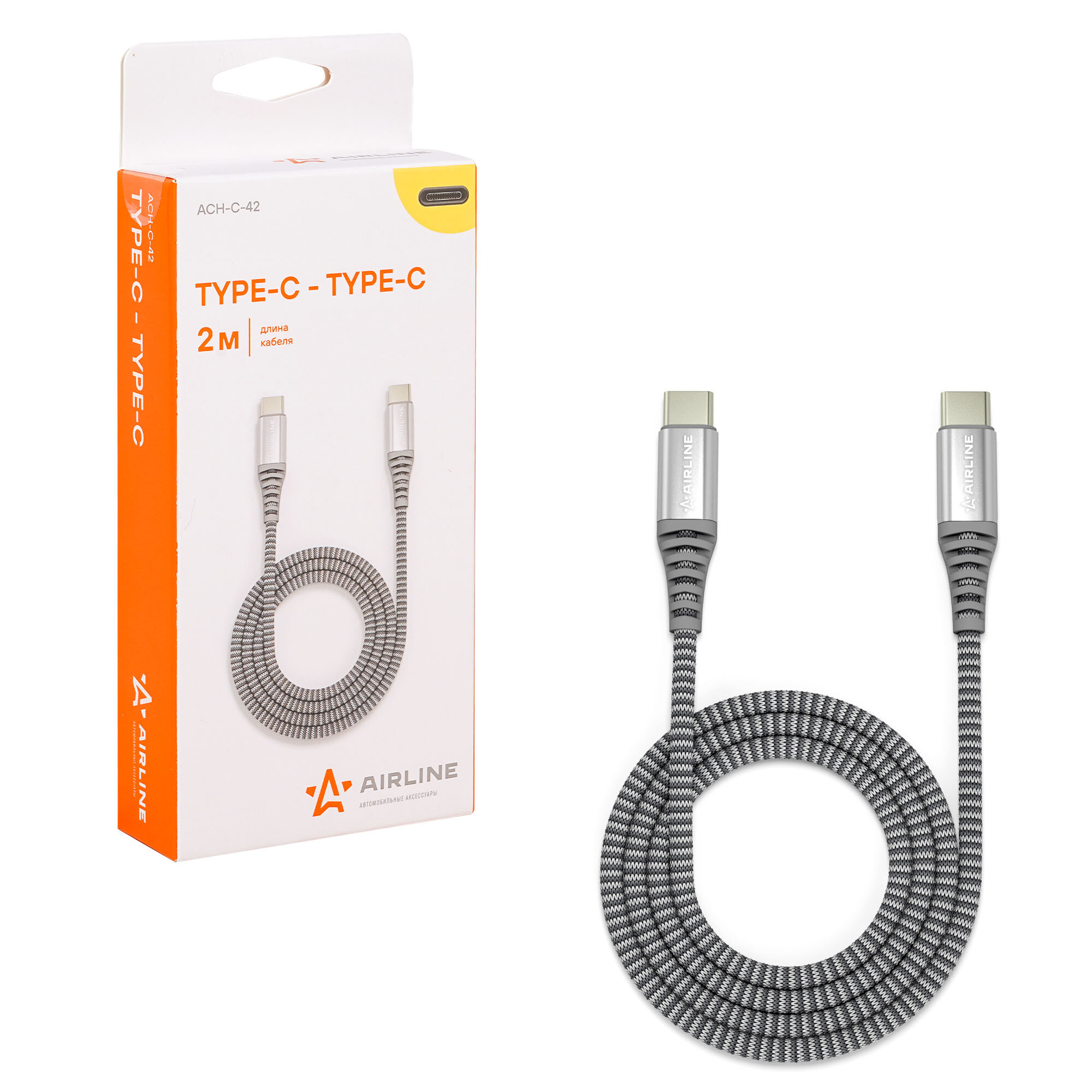Кабель Type-C - Type-C поддержка PD 2м серый нейлоновый AIRLINE (ACH-C-42)