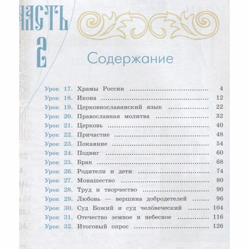Учебное пособие (в двух частях) создано в соответствии с Федеральным государственным образовательным стандартом начального общего образования. Часть 2 учебного пособия раскрывает темы: "Храмы России", "Икона", "Церковнославянский язык", "Православная молитва", "Церковь", "Причастие", "Подвиг", "Брак", "Родители и дети", "Монашество", "Труд и творчество", "Любовь - вершина добродетелей" и другие. В конце уроков - обобщающие вопросы и задания; последний урок включает итоговый опрос. Все задания направлены на духовно-нравственное воспитание, развитие интеллектуальных способностей и креативного мышления учащихся.3-е издание, стереотипное.