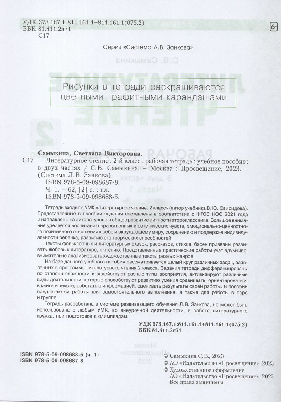 Тетрадь разработана в системе развивающего обучения Л. В. Занкова к учебнику В.Ю. Свиридовой "Литературное чтение. 2 класс", но может быть использована с любым УМК, во внеурочной деятельности, в работе литературного кружка, при подготовке к олимпиадам.
