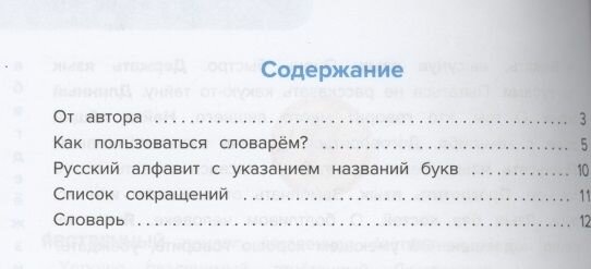 Словарь содержит более тысячи слов. Среди них - однозначные и многозначные слова, омонимы, слова устаревшие и новые. Основная задача словаря - научить младших школьников находить информацию в словаре, расширить их словарный запас, сформировать интерес к изучению русского языка.